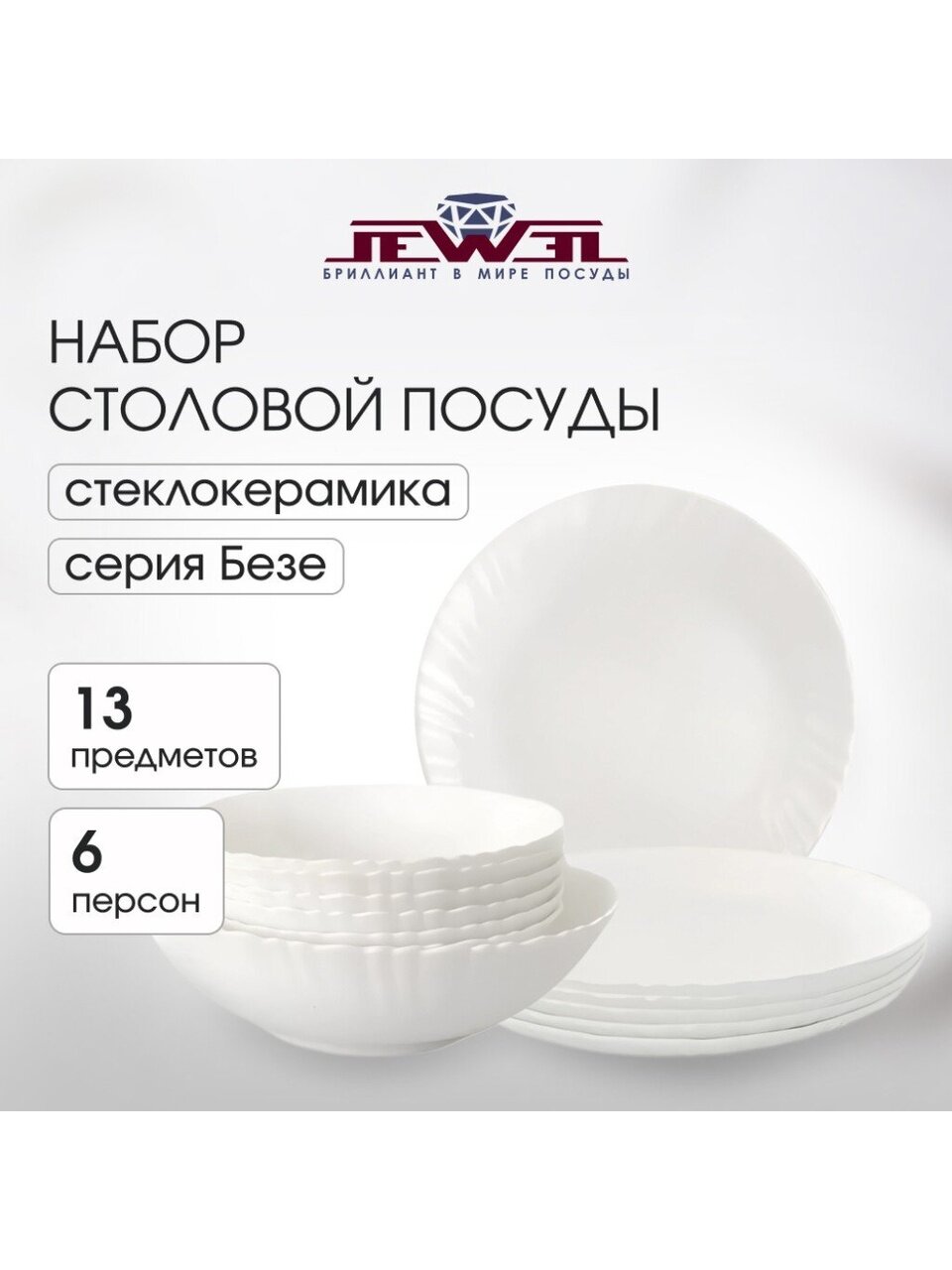 Столовый сервиз из стеклокерамики на 6 персон Jewel Безе — 13 предметов для стильной сервировки, подходит для микроволновки и посудомоечной машины.