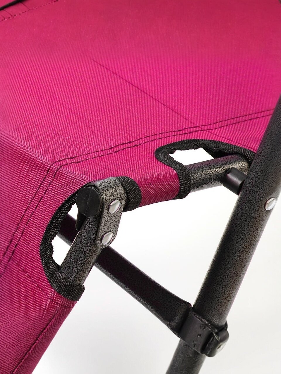 Обивка спинки и сиденья из прочной устойчивой к выцветанию синтетической ткани - полиэстера 600 D. Материал легко моется, так что вы можете быстро и легко очистить лежак от пятен. Ткань надежно соединяется с каркасом стильным крупным стежком. Высококачественная широкая рама, выполненная из металла, добавляет ощущение безопасности и дополнительного комфорта. Металлическая рама обеспечивает надежность конструкции, лежак выдерживает до 100 кг.