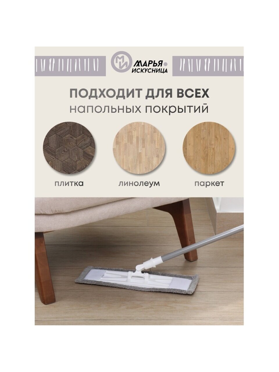 Швабра с насадкой из микрофибры подходит для влажной уборки и мытья полов из любых материалов, идеальна для ухода за натуральными напольными покрытиями: паркетная доска, пробковые полы, сизаль. Не оставляет разводов и ворсинок. Позволяет сократить время сухой и влажной уборки полов. Прекрасно справляется с уборкой в труднодоступных местах: под шкафами, диванами и т.п.