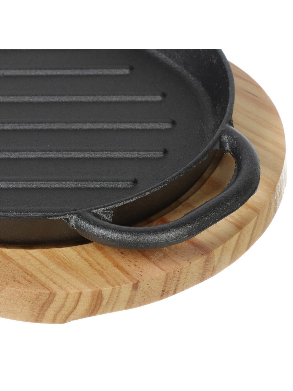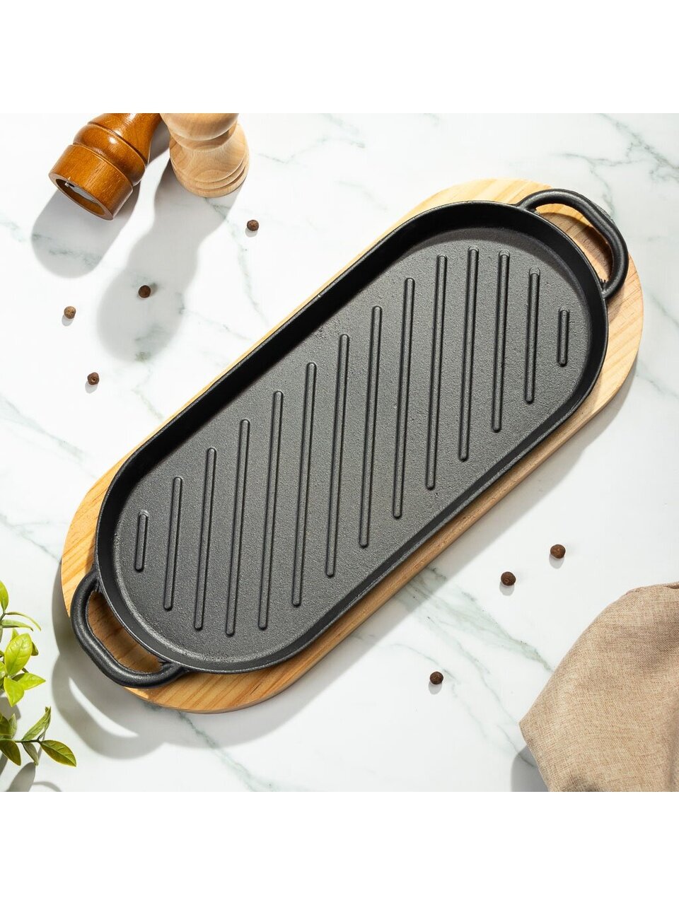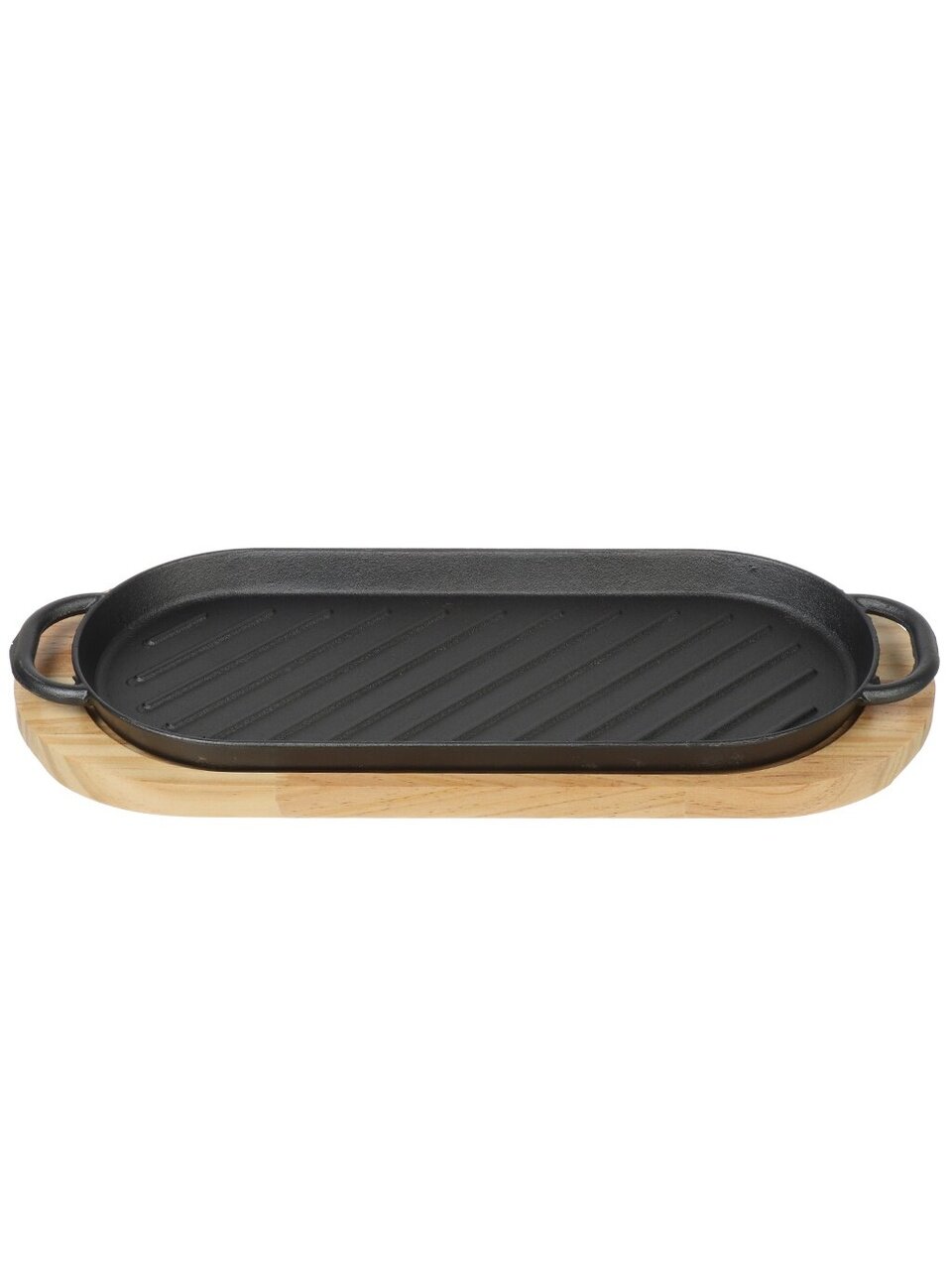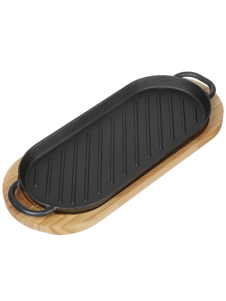 Чугунная сковорода-гриль 37.8х16.6 см с бамбуковой подставкой — идеальный выбор для сочного мяса и рыбы на домашней кухне и даче. Толстое рифленое дно, натуральные материалы, долговечность.