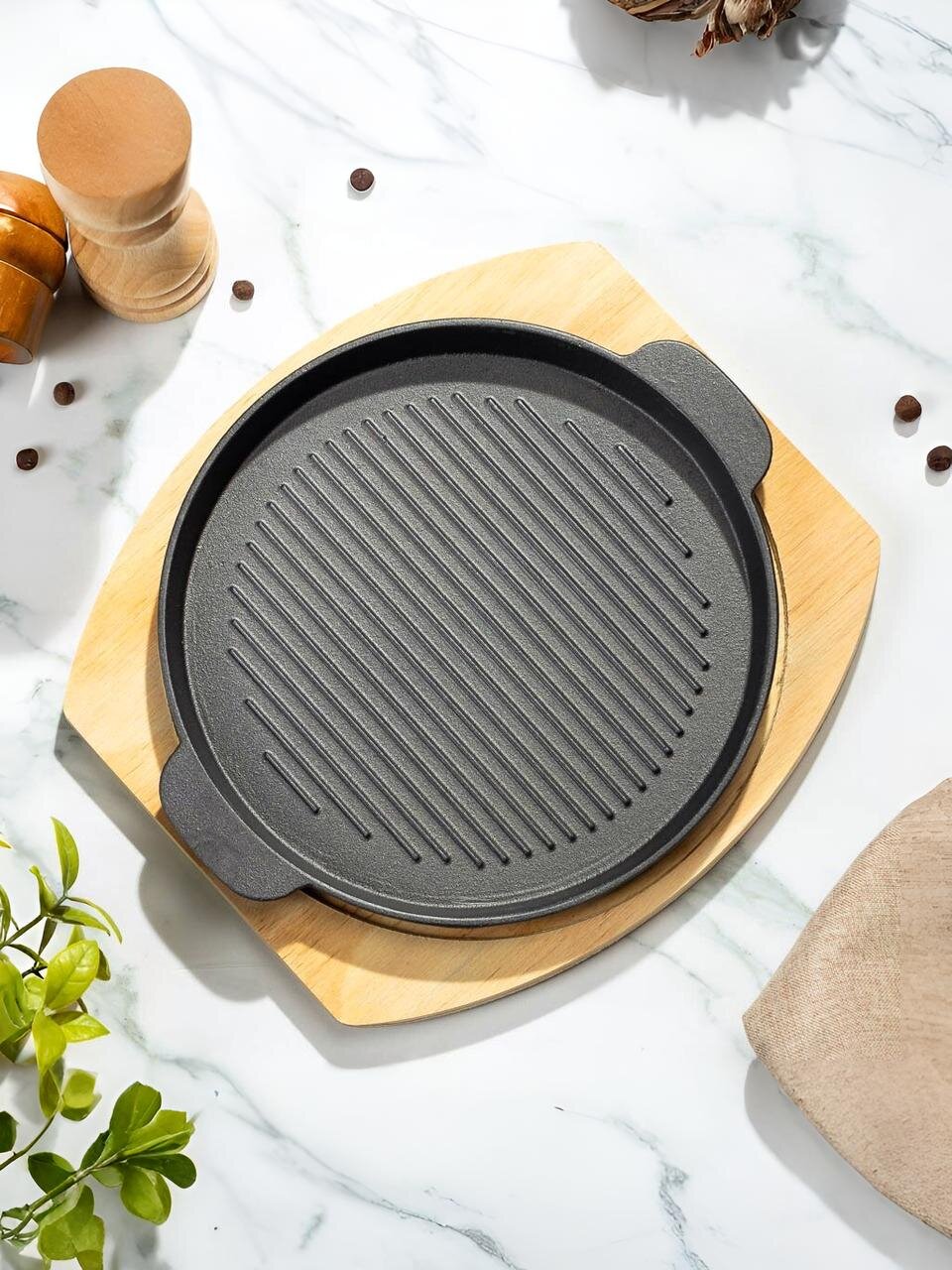 В отличие от аналогов с антипригарным слоем, чугунная сковорода долговечнее, не боится царапин и при правильном уходе становится только лучше. Она не подходит для индукции, но идеальна для газовых, электрических и стеклокерамических плит, а также для духовки и гриля. Подставка из бамбука защитит стол от нагрева и добавит эстетики сервировке. Как использовать чугунную сковороду? Просто разогрейте, добавьте немного масла — и наслаждайтесь вкусом блюд, как из ресторана.