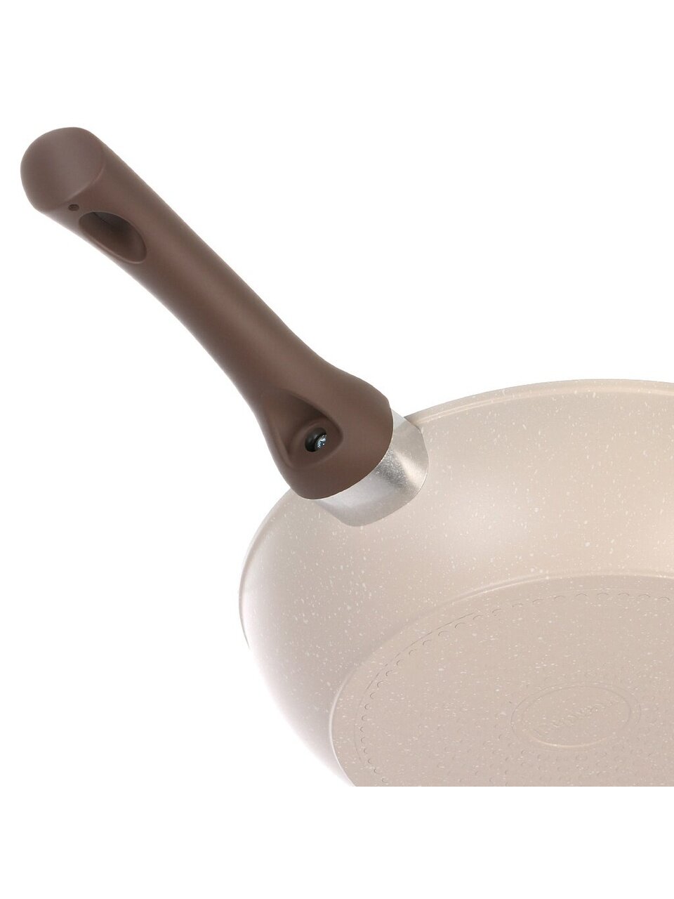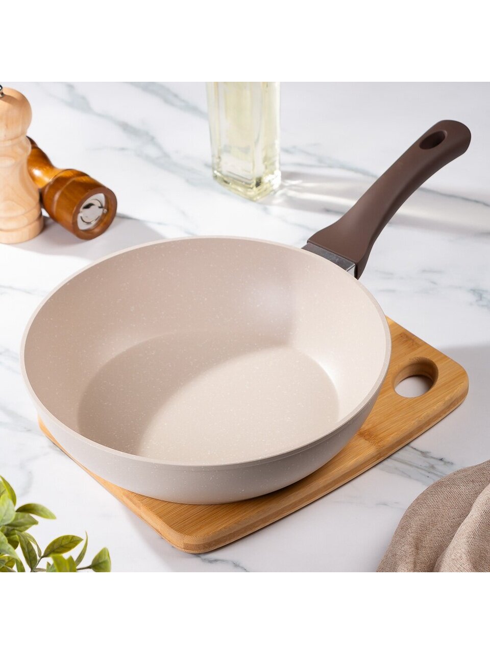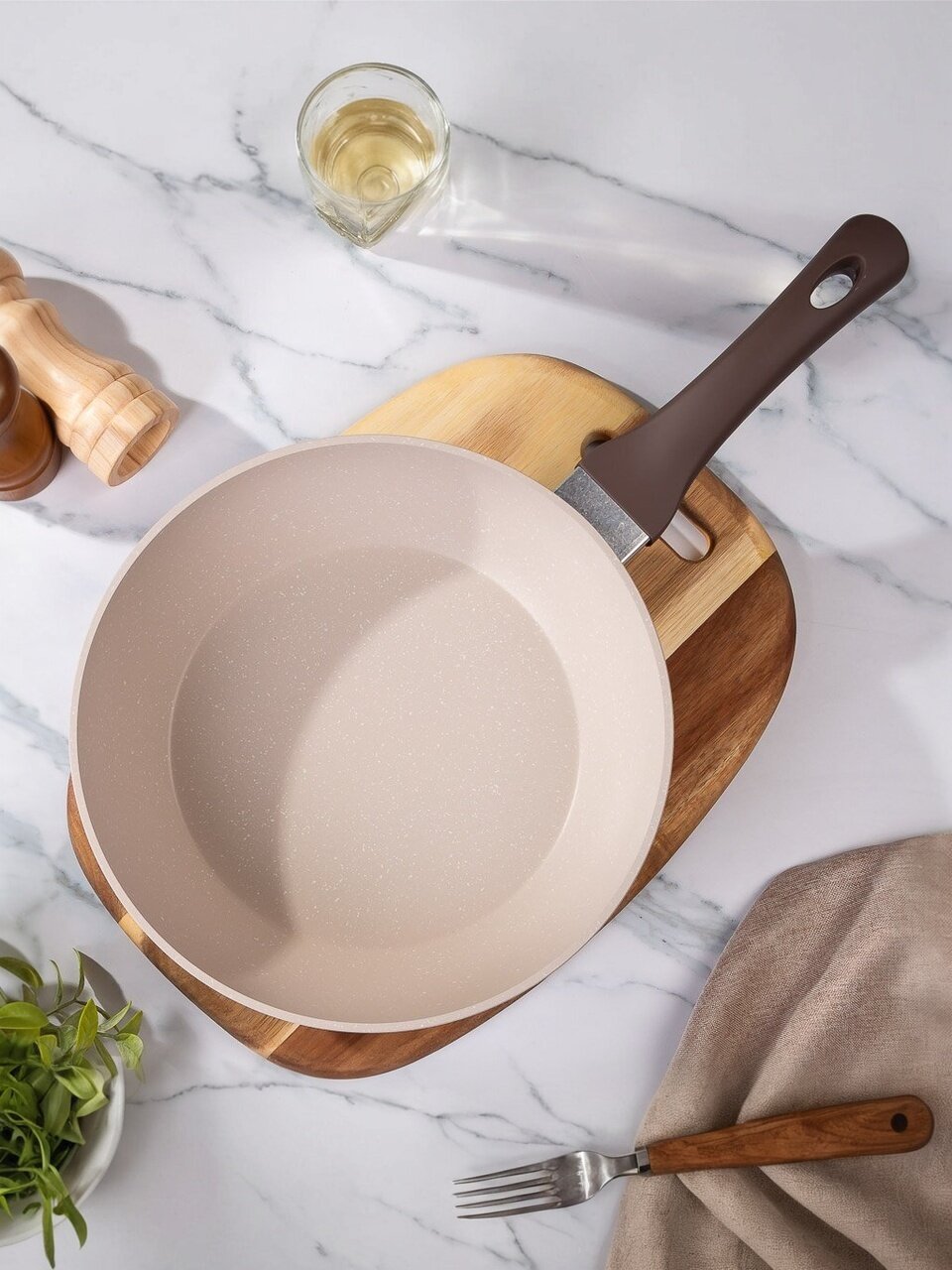 В отличие от классических штампованных моделей, литой алюминий обеспечивает равномерный прогрев и устойчивость к деформации. Сковорода не требует особого ухода: ее можно мыть в посудомоечной машине, а прочное покрытие сохраняет свойства даже при активном использовании. Если вы ищете, какую сковороду купить недорого для дачи или подарка, обратите внимание на эту модель — она сочетает надежность, универсальность и современный дизайн в бежевом цвете.