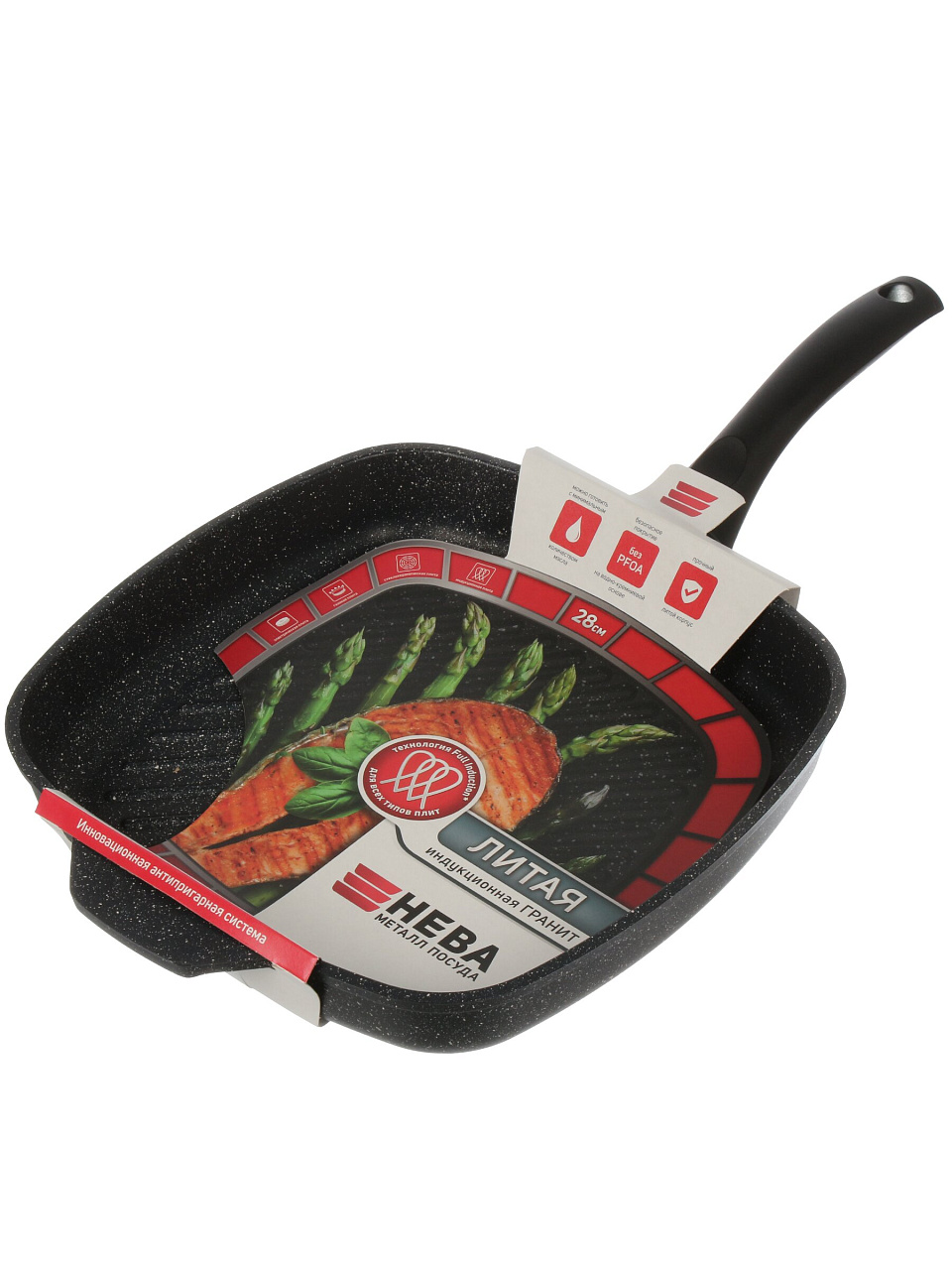 Сковорода-гриль Нева Металл 28 см — литой алюминий, антипригарное покрытие, подходит для индукции. Быстрый гриль дома и на даче без масла и пригорания.