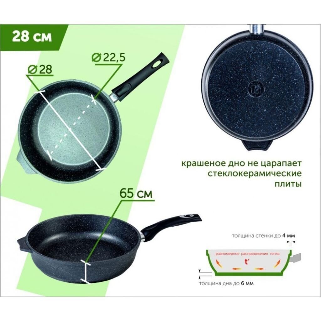 - Оптимальный размер 28 см, литой алюминий, толщина дна 6 мм — равномерный нагрев и долговечность