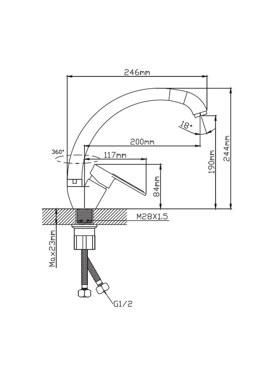 Для установки потребуется отверстие диаметром 35 мм, стандарт подключения подводки — 1/2".
