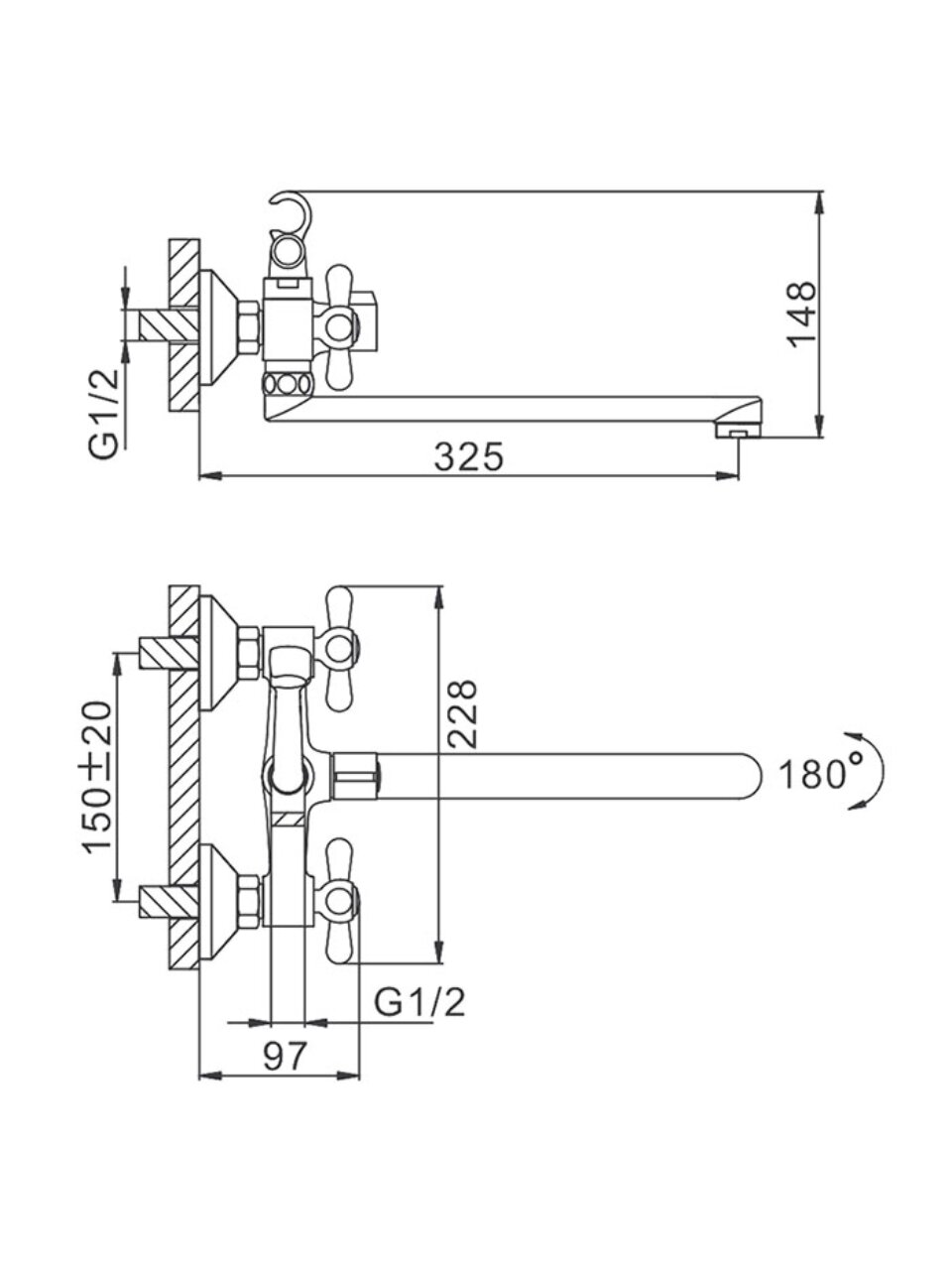 Межосевое расстояние — 150 мм, длина излива — 30 см, монтаж настенный, вертикальный, через 2 отверстия. Стандарт подводки шланга — 1/2".