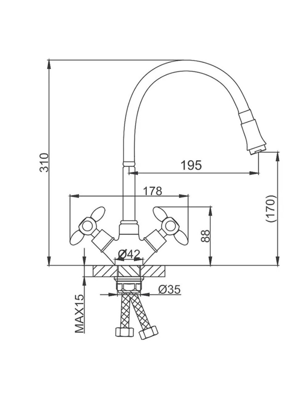 Высота излива — 17 см, длина — 19,5 см, монтаж в одно отверстие диаметром 42 мм. Подходит для большинства стандартных кухонных моек.