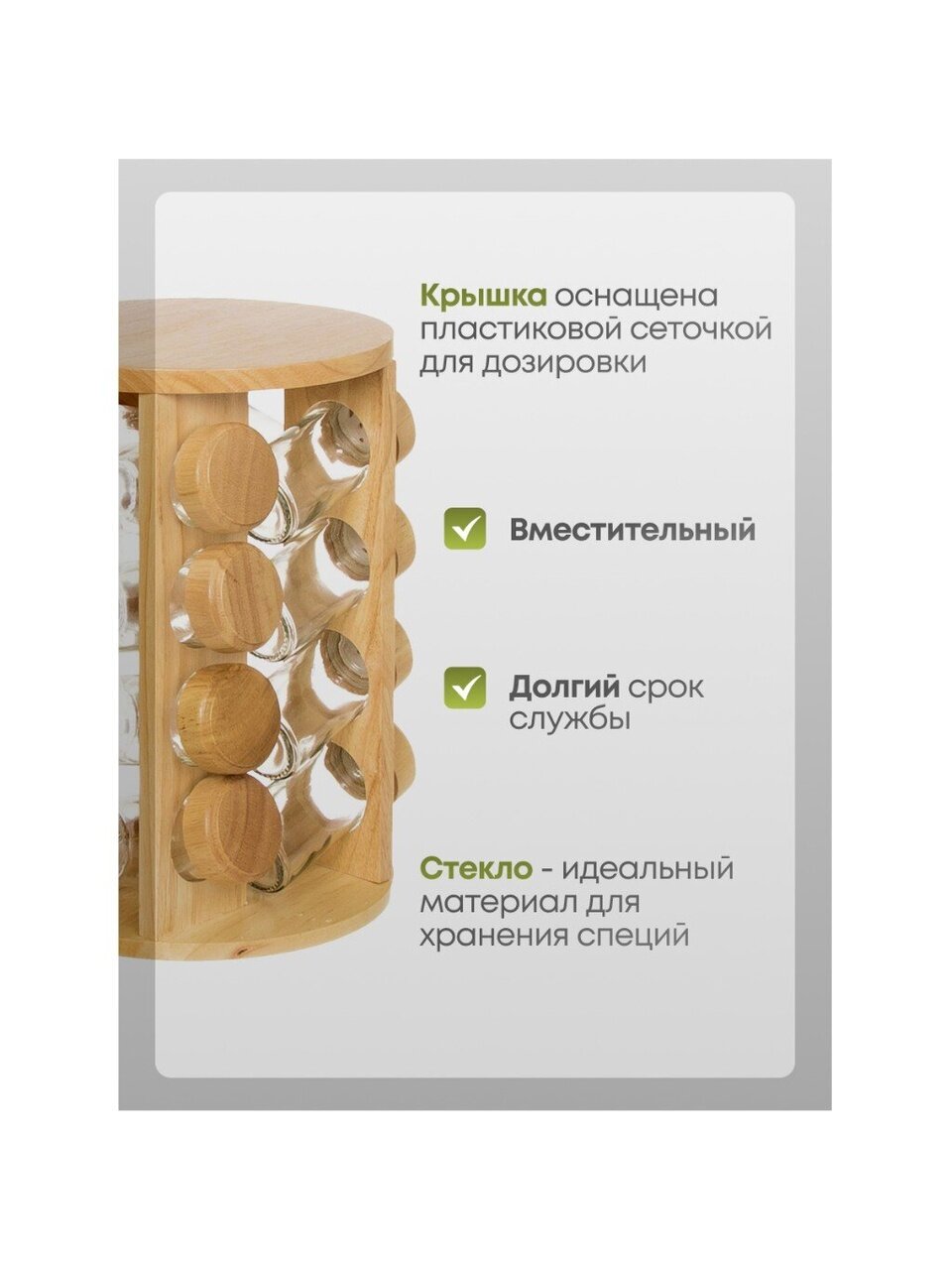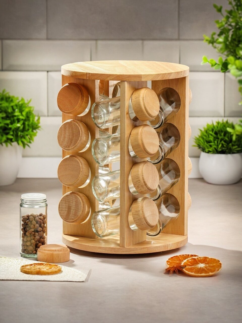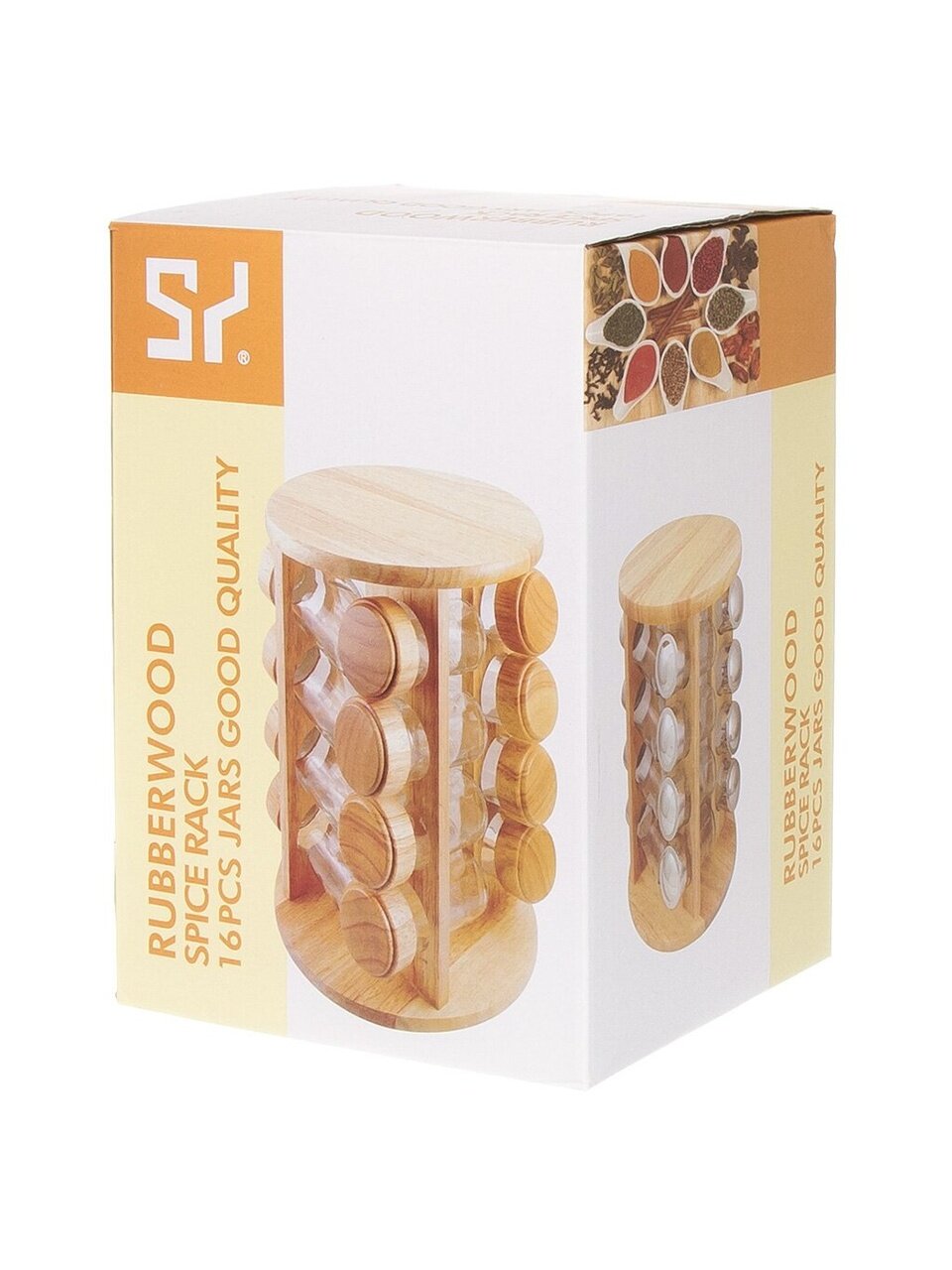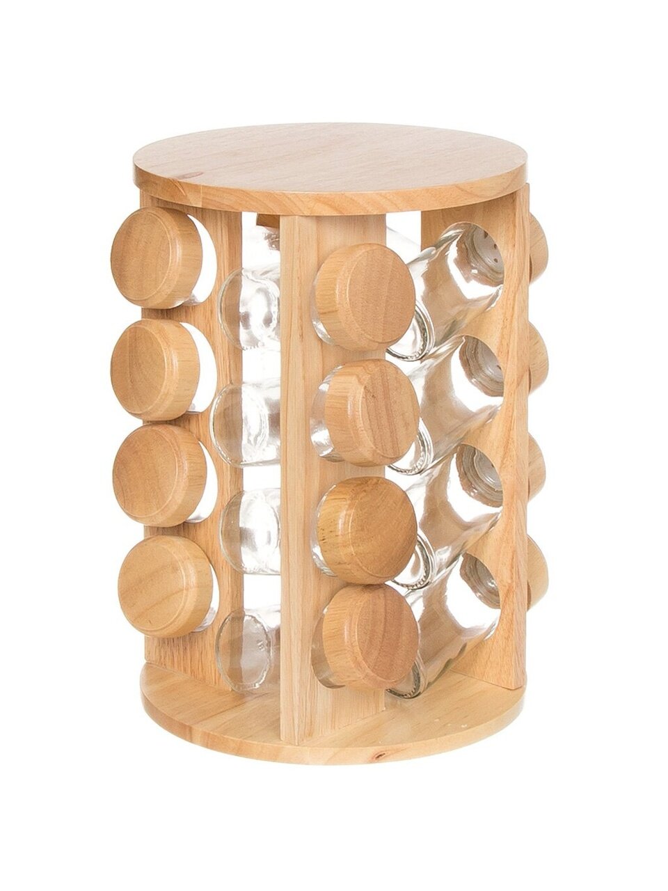 Набор для специй удобен и прост в использовании. Он вмещает 16 стеклянных банок. Емкости надолго сохранят первоначальный аромат пряностей или приправ. Модель выполнена из дерева (бамбук).