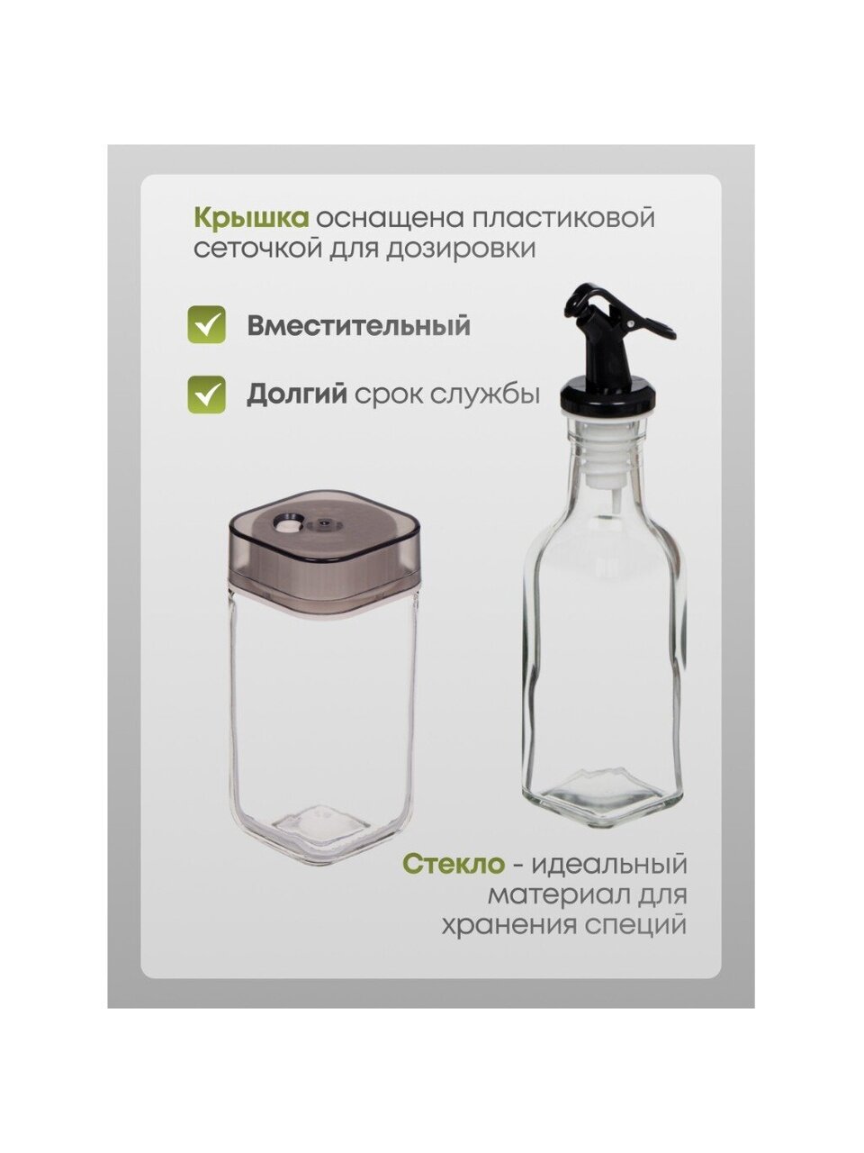 Этот набор - прекрасный пример высококачественной, удобной и лаконичной посуды для изящной сервировки стола. Бутылки и емкости для специй выполнены из стекла.