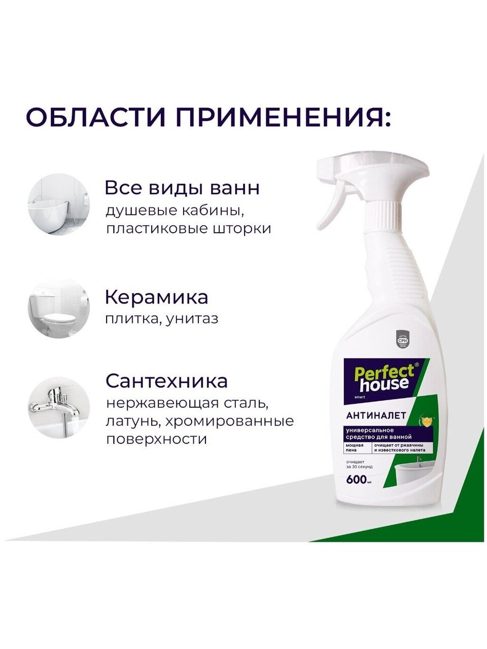 Универсальное чистящее средство Perfect House идеально для уборки ванной комнаты, удаления известкового налета, ржавчины. Спрей антиналет предназначен для чистки всех видов ванн, душевых кабин, сантехники, плитки, пластиковых шторок.
