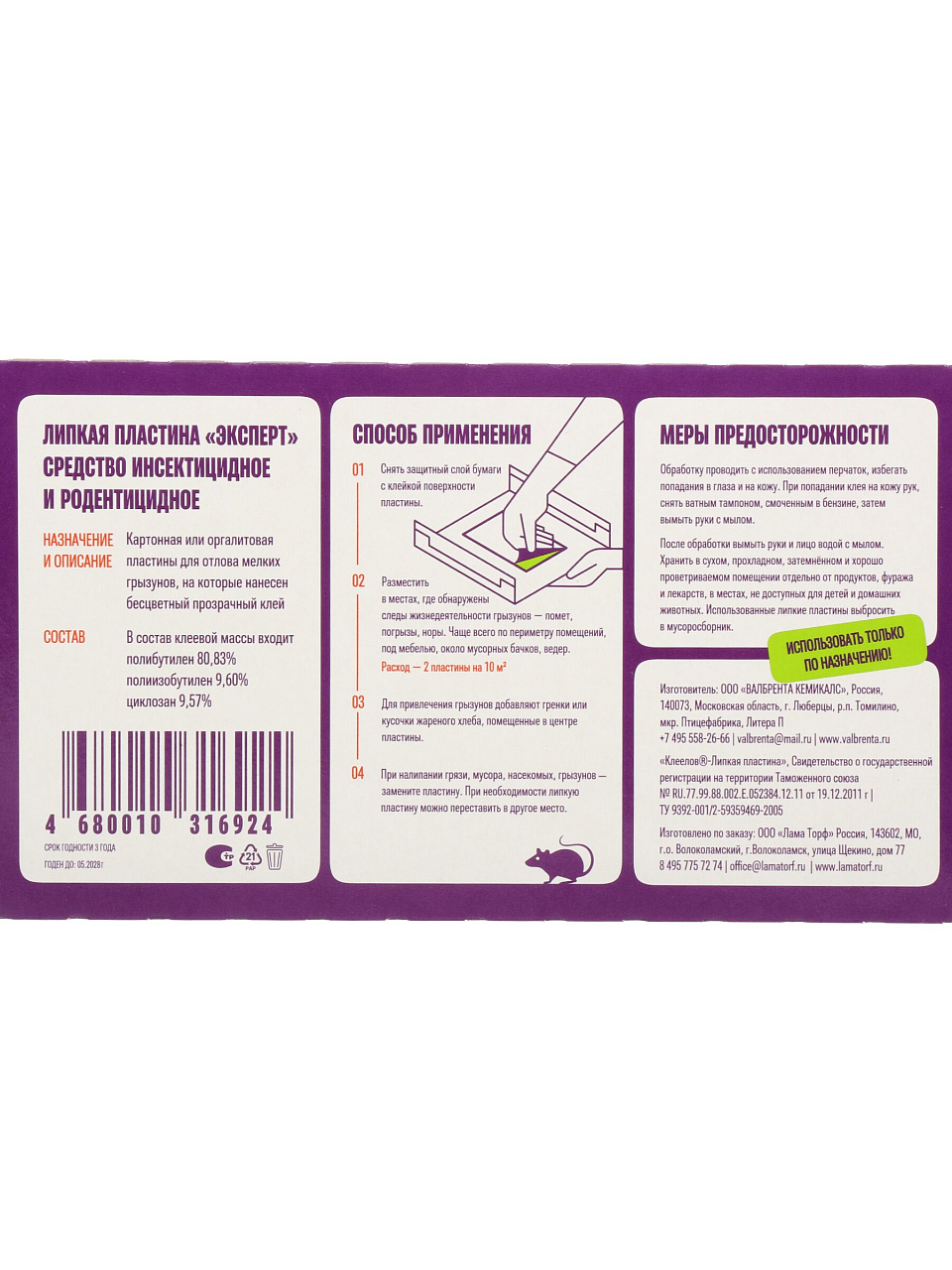 Снимите защитную пленку, разместите ловушку клеевой стороной вверх вдоль стен или в местах скопления грызунов. После заполнения пластину утилизируйте в бытовом мусоре.