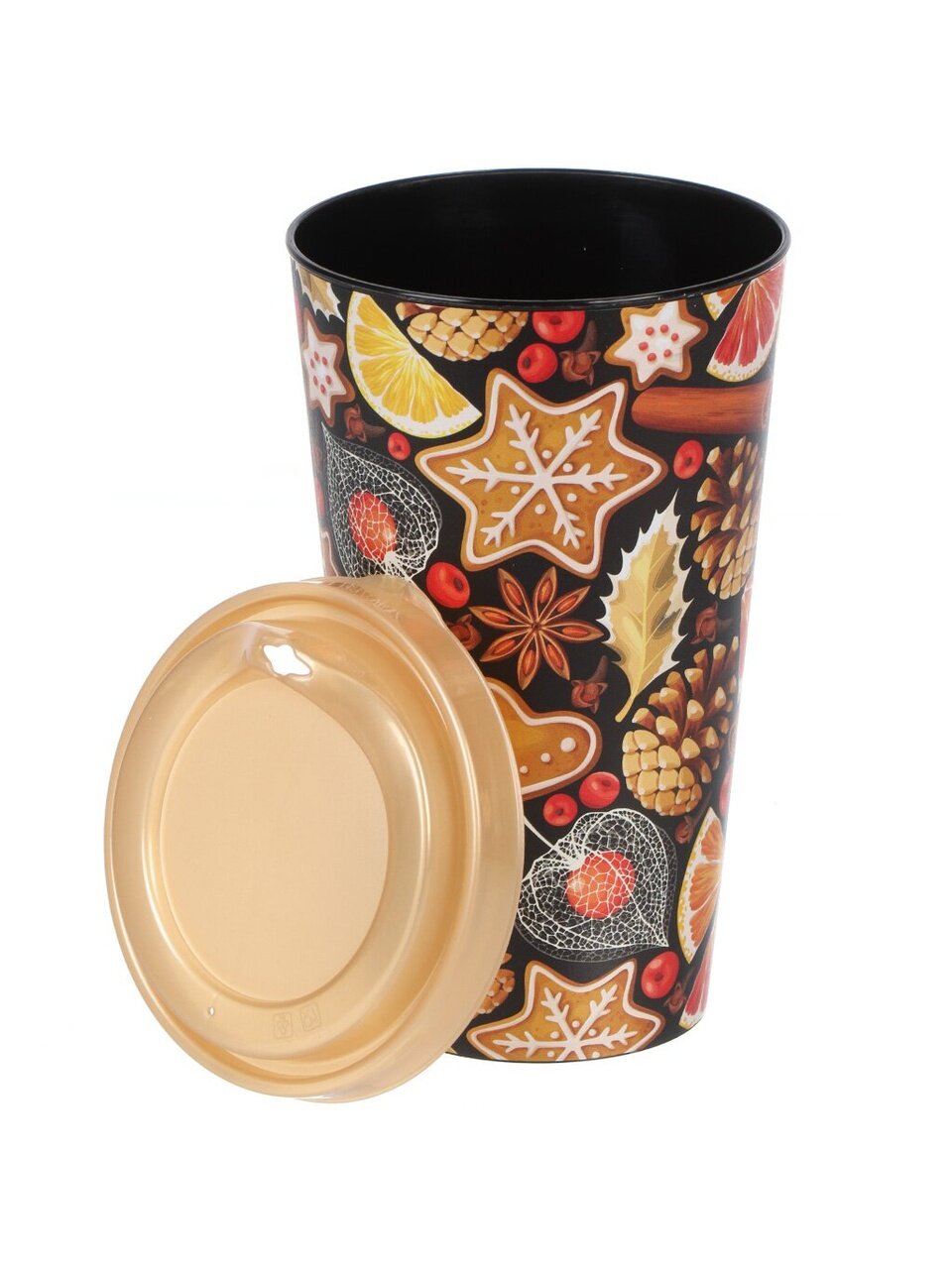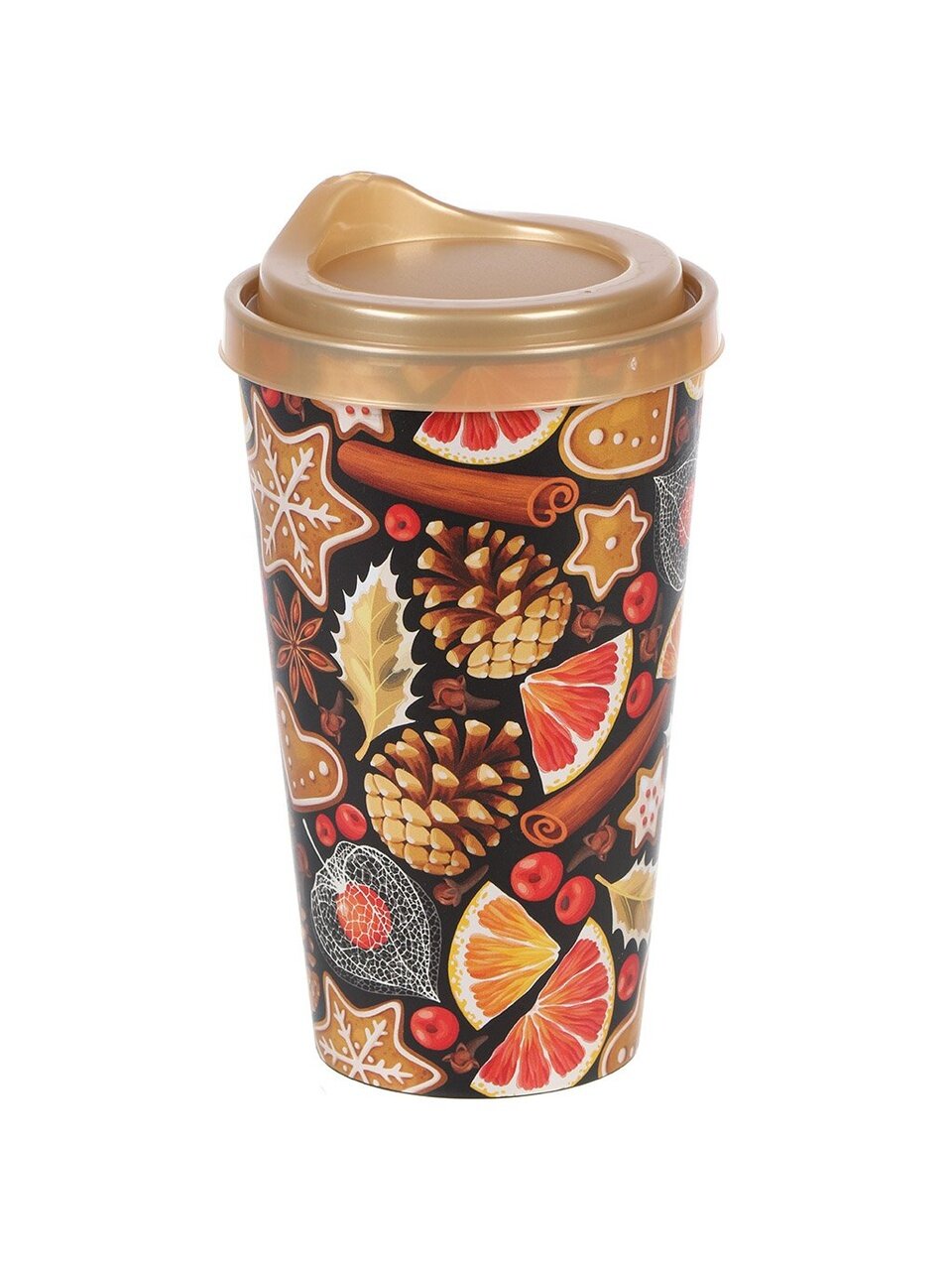 - Яркий новогодний декор и золотая крышка — выделяется среди стандартных стаканов, создаёт праздничное настроение