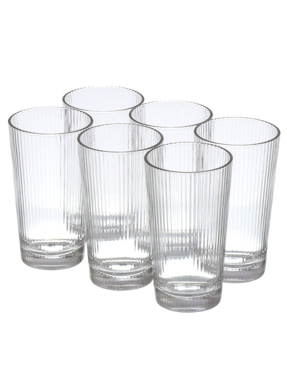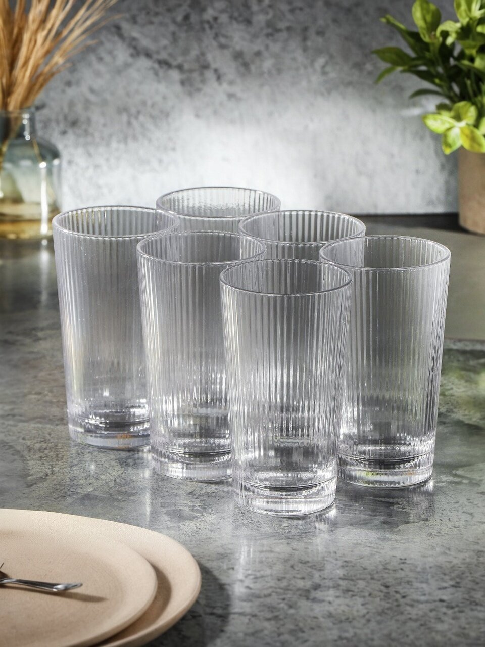 В комплекте 6 больших стеклянных стаканов объёмом 370 мл. Форма — коллинз, стиль — современный, цвет — прозрачный.