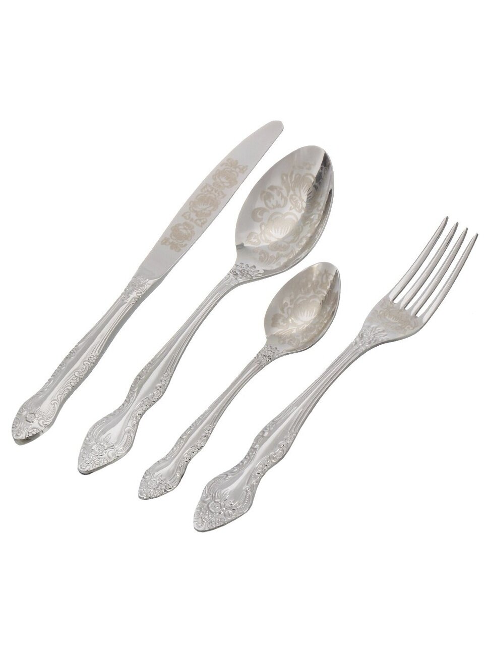 В комплекте 24 столовых прибора из нержавеющей стали, рассчитанных на 6 персон: по 6 ложек, вилок, ножей и чайных ложек. Длина каждого прибора — 21,5 см.