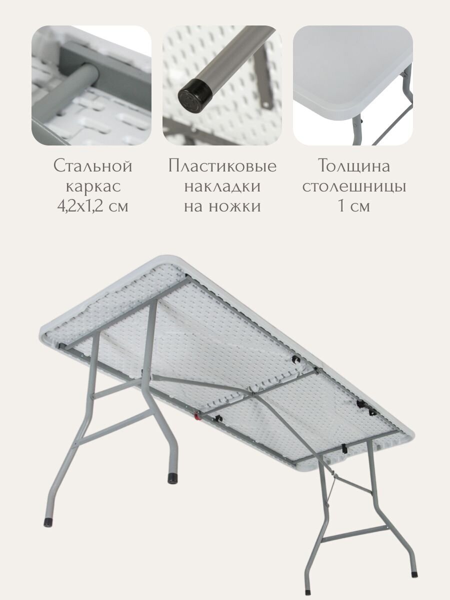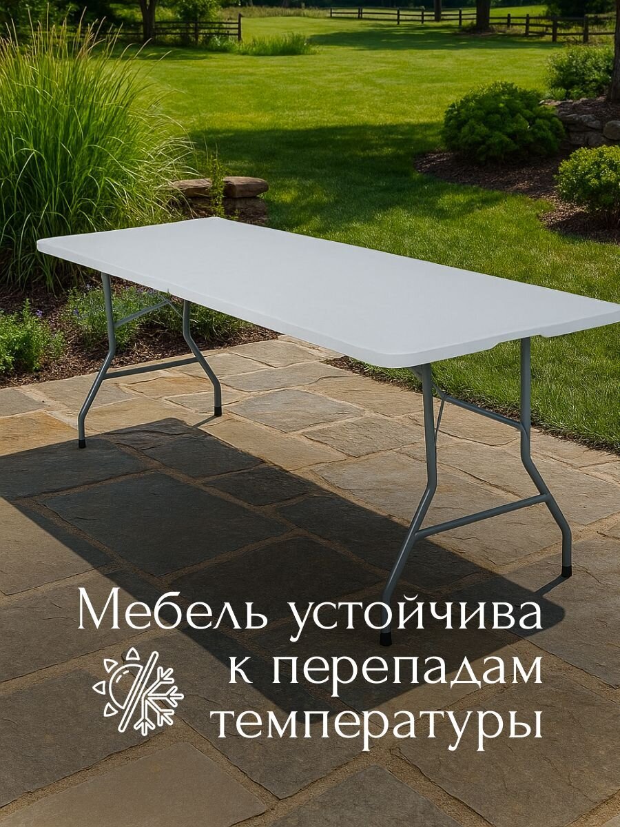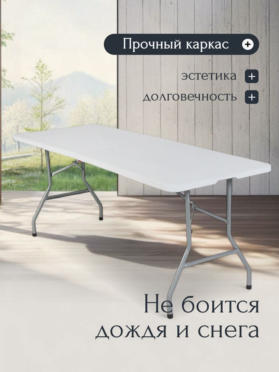 Стол 180х70х74 см, белый, C010179 — идеальное решение для создания стильного и функционального пространства в доме или на даче. Современный дизайн и универсальный белый цвет позволяют гармонично вписать этот стол в любой интерьер, будь то кухня, гостиная, рабочий кабинет или зона отдыха на веранде. Прямоугольная столешница из пластика обеспечивает легкость ухода и устойчивость к ежедневным нагрузкам, а металлическое основание гарантирует прочность и долговечность конструкции. Благодаря оптимальным размерам стол отлично подходит для семейных обедов, организации рабочих процессов или приема гостей.