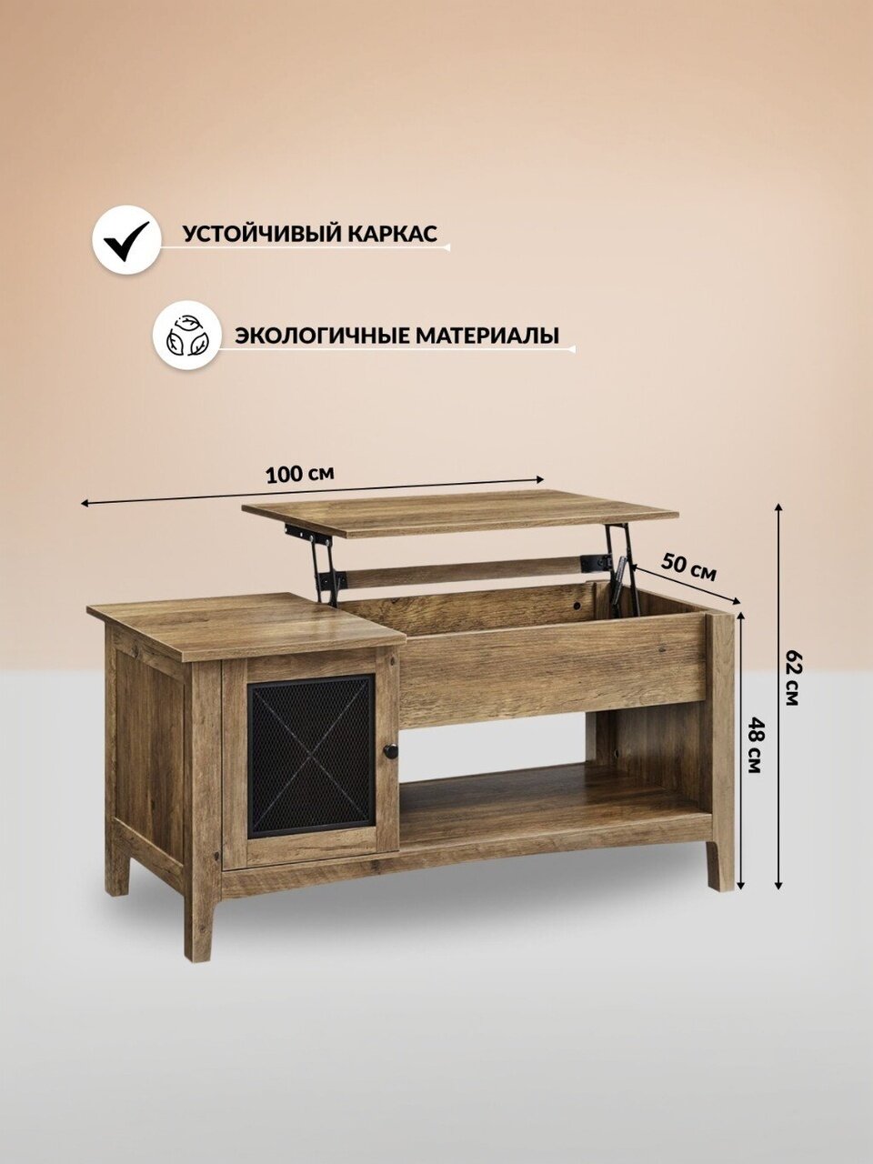 Столик изготовлен из качественных ДСП и ДВП, которые придают ему прочную конструкцию. Подъемный механизм усилен перекладиной.