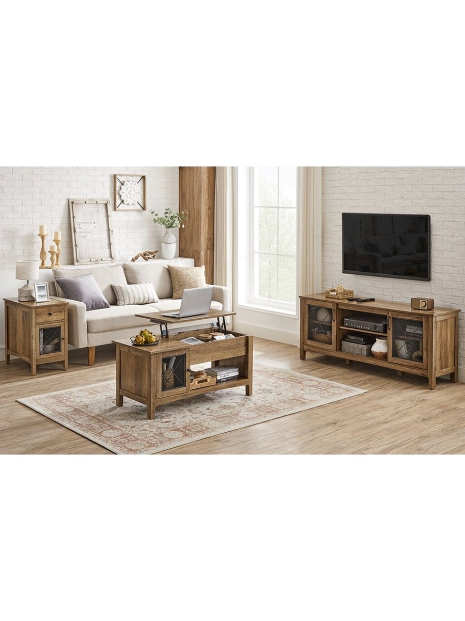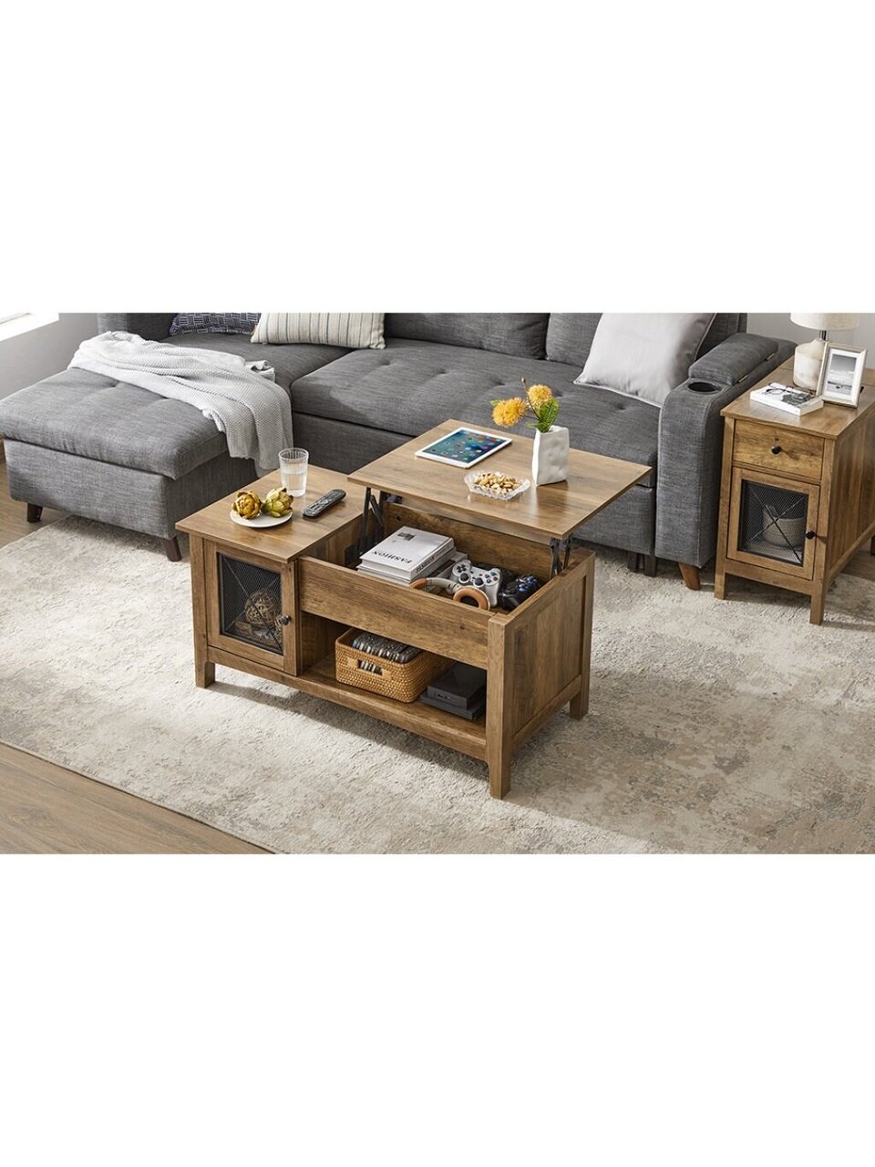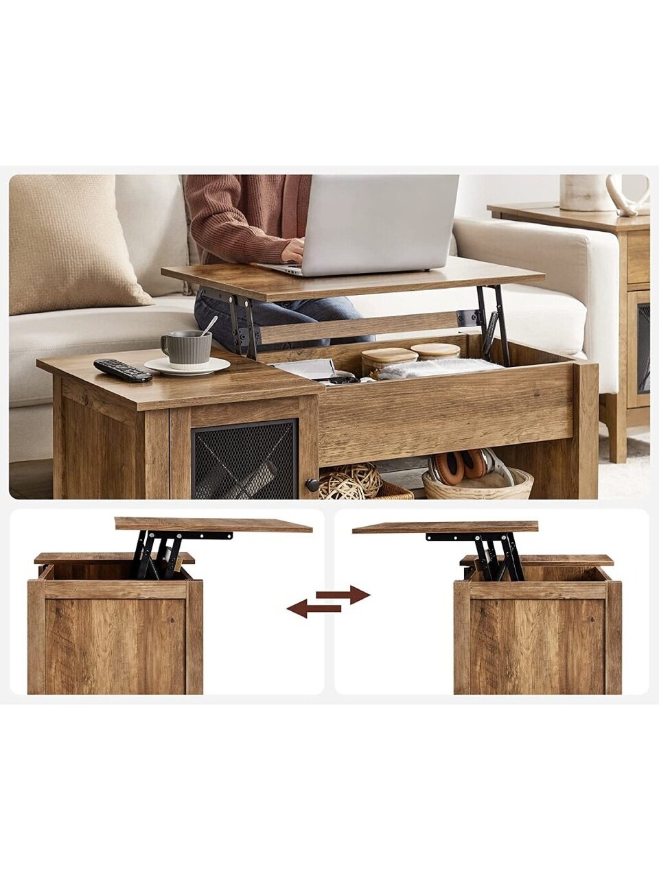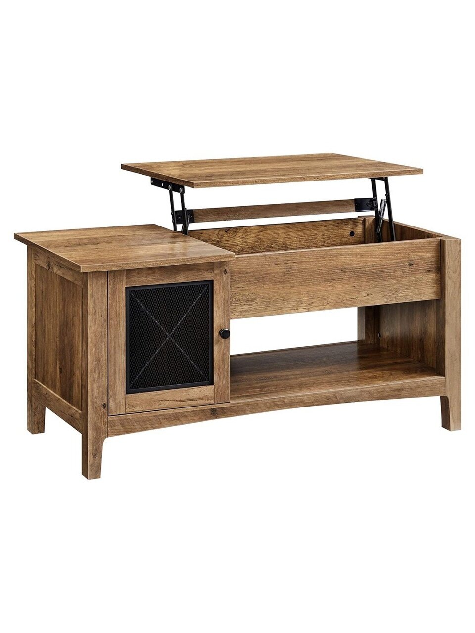 Выполненный в оттенке грецкого ореха и украшенный дверцей из черной металлической сетки, этот столик с подъемной крышкой привлечет всеобщее внимание.