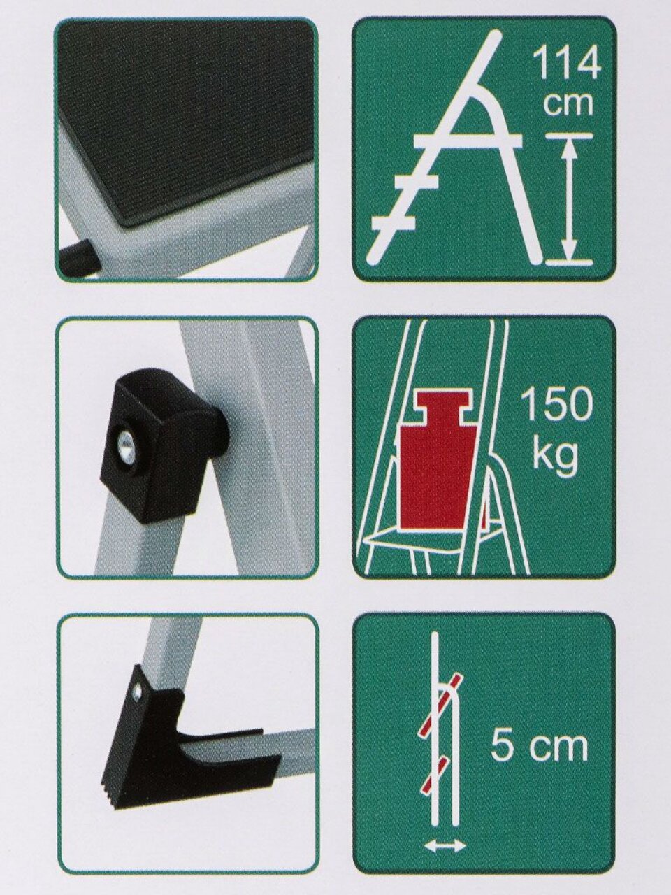 - Стремянка имеет пять ступеней, что делает ее удобной для выполнения работ на разных высотах. Вы можете легко достать до высоких полок, заменить лампочку или выполнить другие работы, не используя дополнительные инструменты.