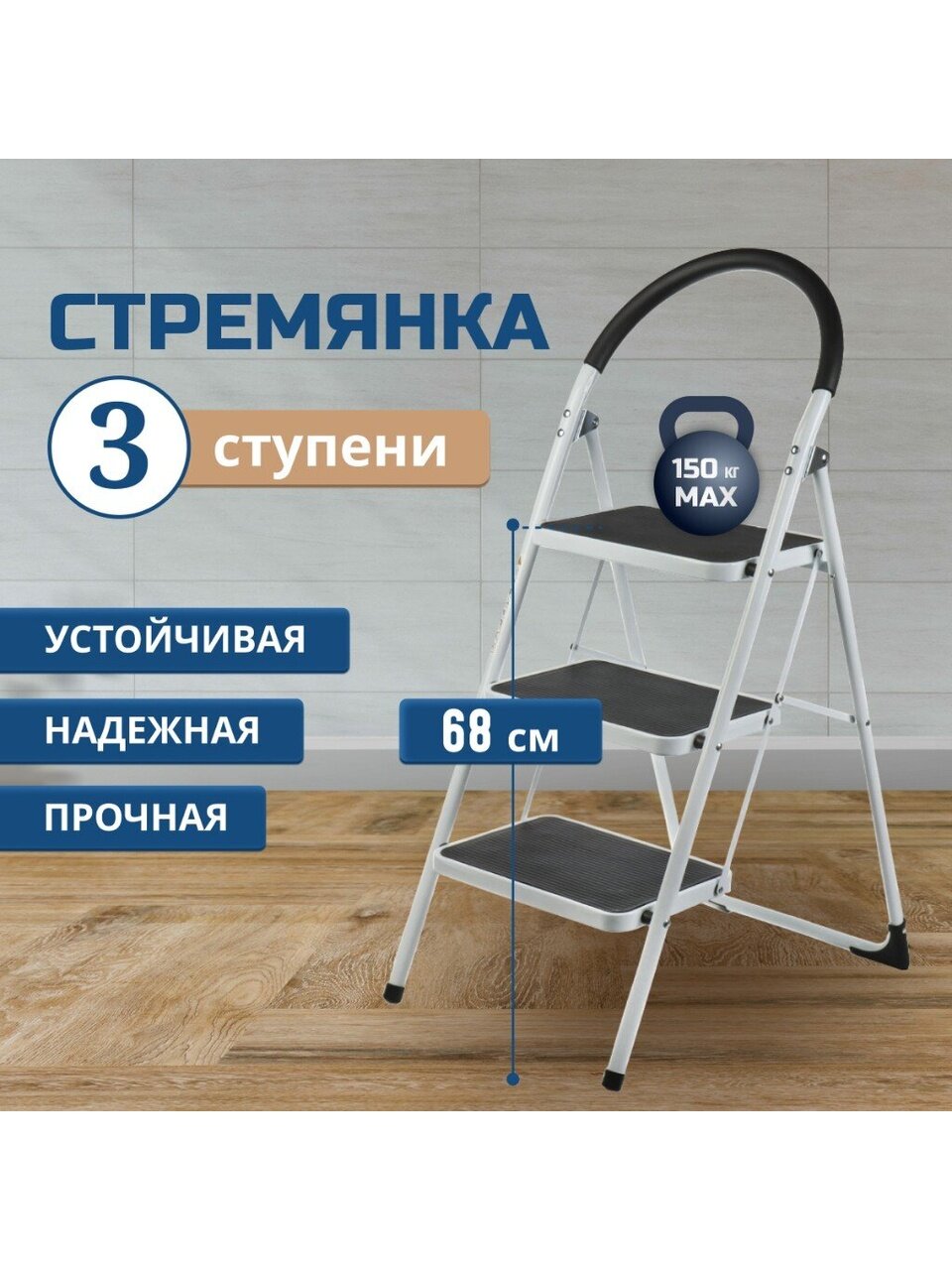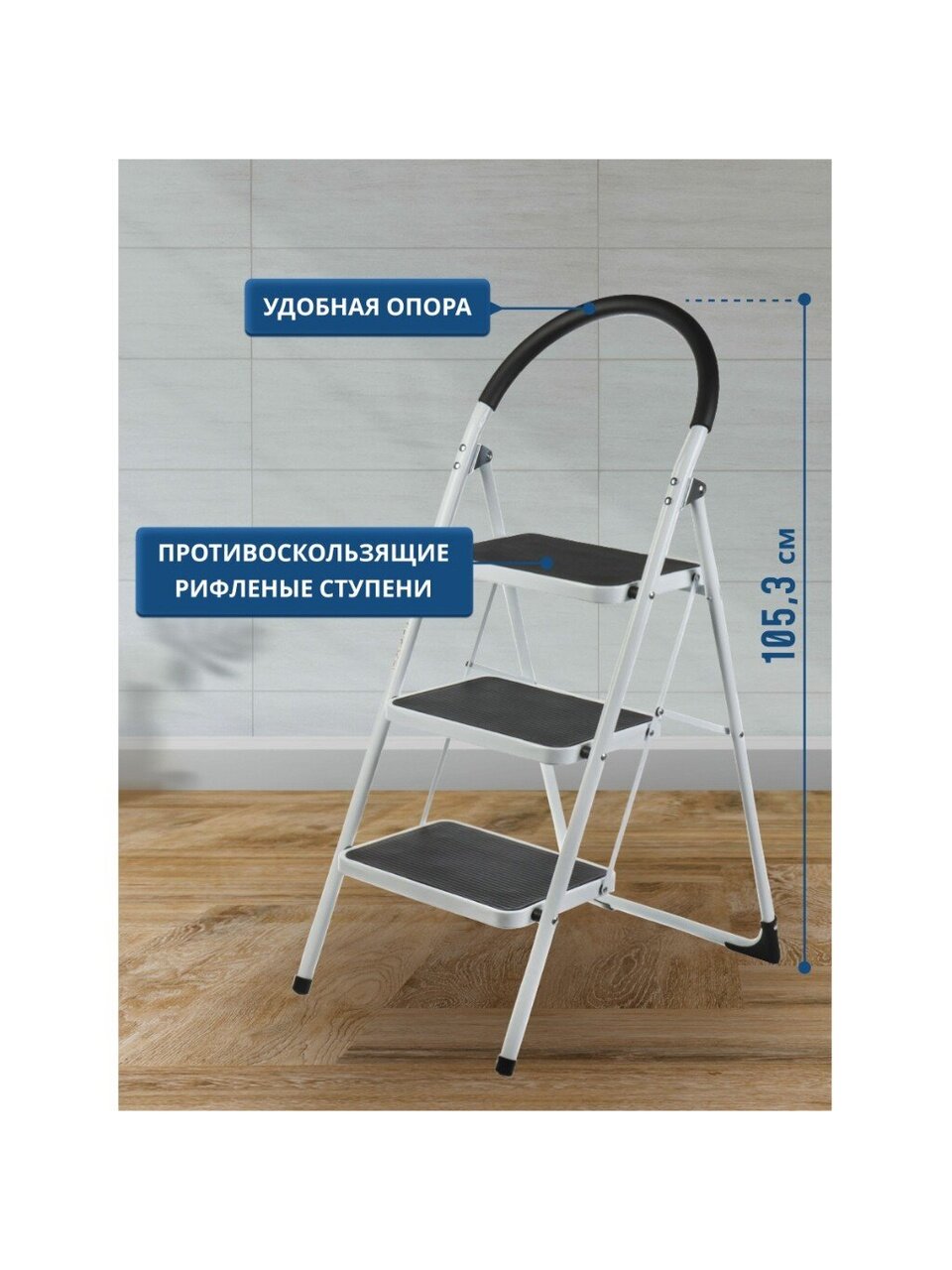 Изготовленная из прочного металла, стремянка обладает высотой 1.053 метра и выдерживает максимальную нагрузку до 150 кг. Это делает ее подходящей для большинства домашних задач. Складная конструкция позволяет легко хранить стремянку, не занимая много места в вашем доме или гараже. Она легка в транспортировке и установке, что делает ее идеальной для использования в любом уголке вашего дома.
