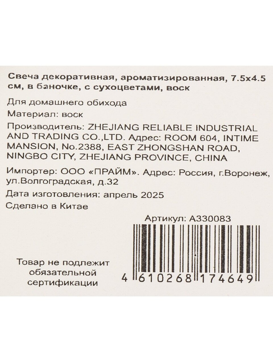 Вы можете приобрести «Свеча декоративная, 7.5х4.5 см, ароматизированная, в баночке, с сухоцветами, воск, A330083» и другие товары в нашем интернет-магазине в Санкт-Петербургe по низким ценам и с бесплатным самовывозом.