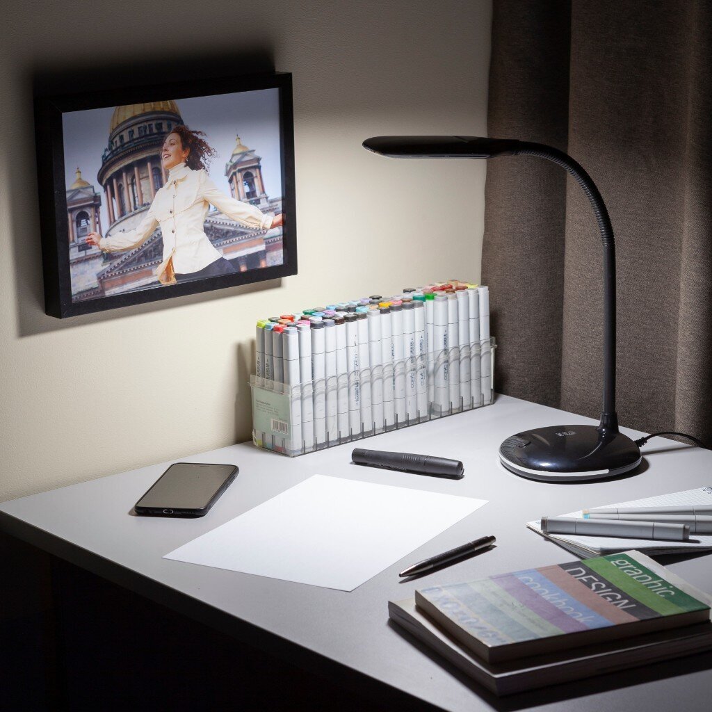 Настольный светильник ЭРА NLED-477-8W-BK со светодиодами (LED) в качестве источников света. У светильника выключатель на основании. Это базовая модель с оптимальным универсальным дизайном хорошей для работы за столом высоты (40 см). Гибкая стойка позволяет выбирать наиболее комфортное направление света.