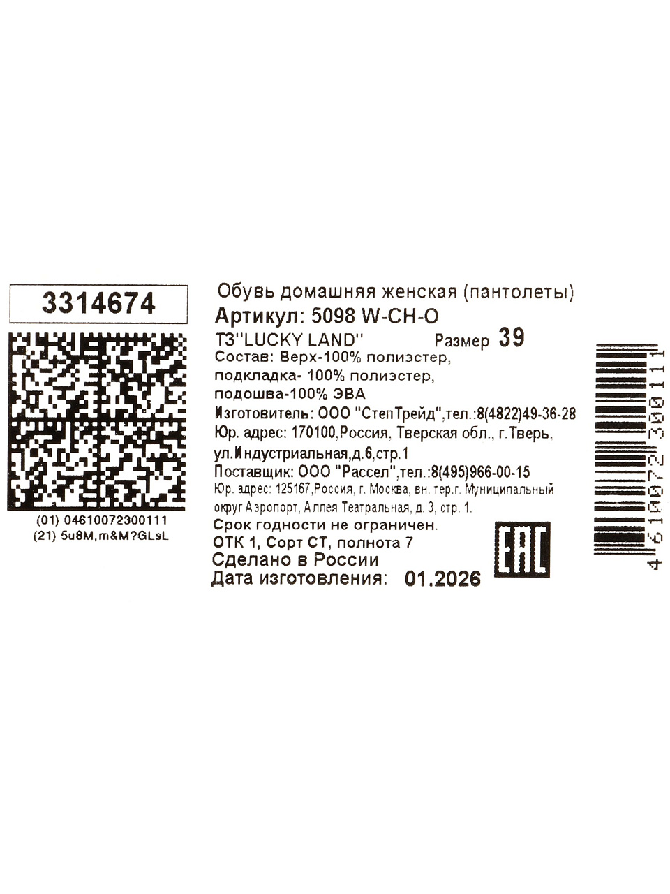 Какой материал у тапок Lucky Land 5098W-CH-O?
