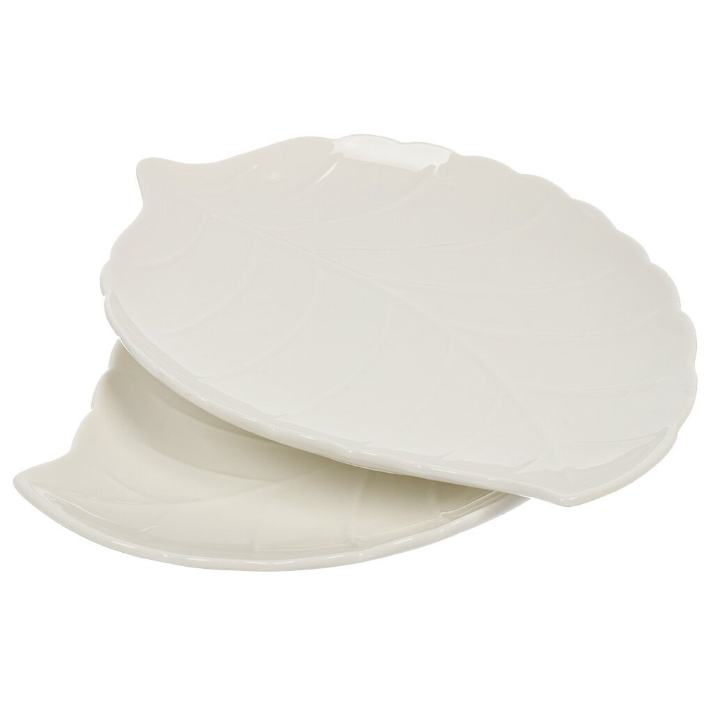 В наборе 2 тарелки, каждая размером 27,7×20,5×2,5 см, форма — лист, цвет — белый, без рисунка.