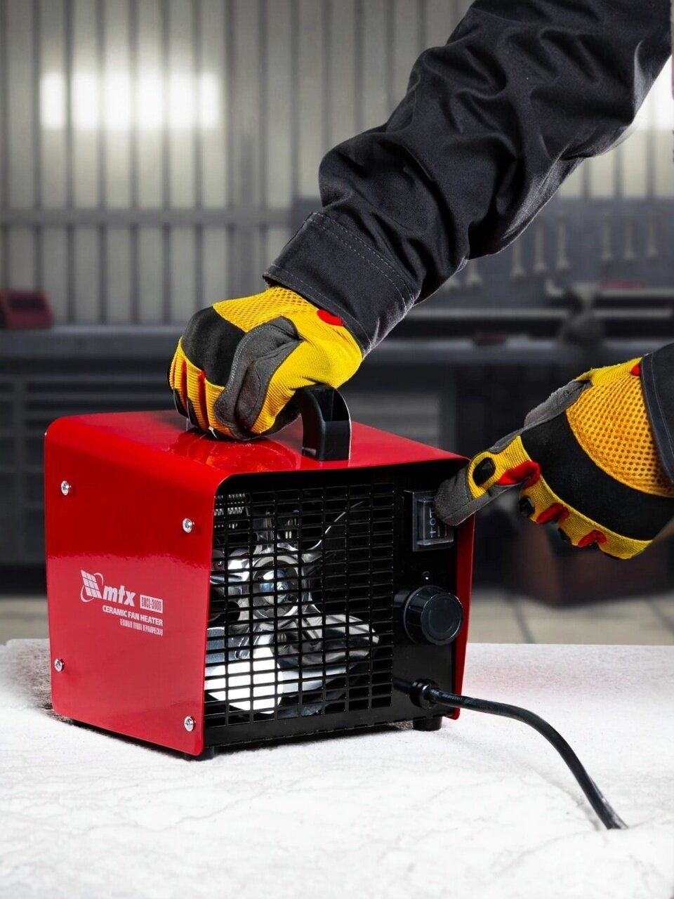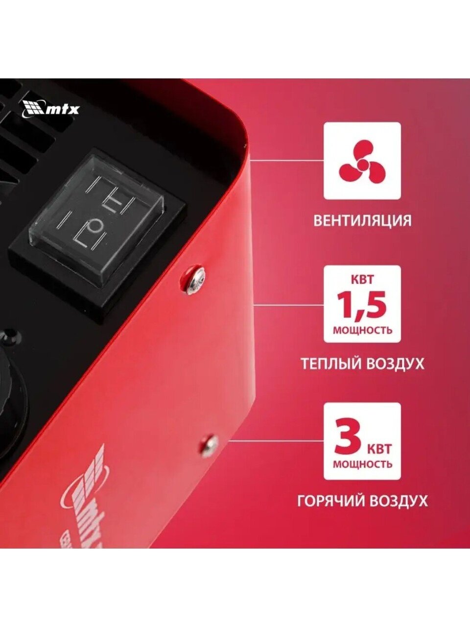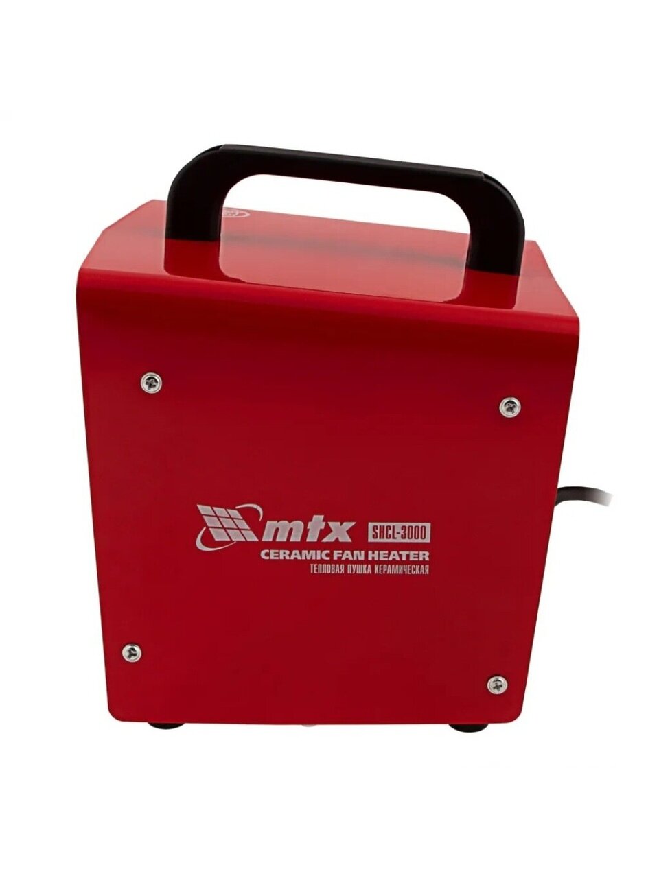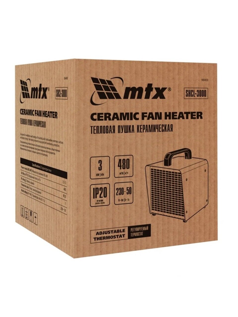 Керамическая тепловая пушка MTX SHCL-3000 производительностью 480 куб. м/ч, в квадратном корпусе, работает в режиме нагрева на полной мощности 3 кВт или частичной 1,5 кВт, а также в режиме вентиляции. Предназначена для обогрева цехов, складов, мастерских и других нежилых помещений площадью до 40 кв. м. Также позволяет быстро просушивать различные поверхности, например, стяжки пола или оштукатуренные стены.