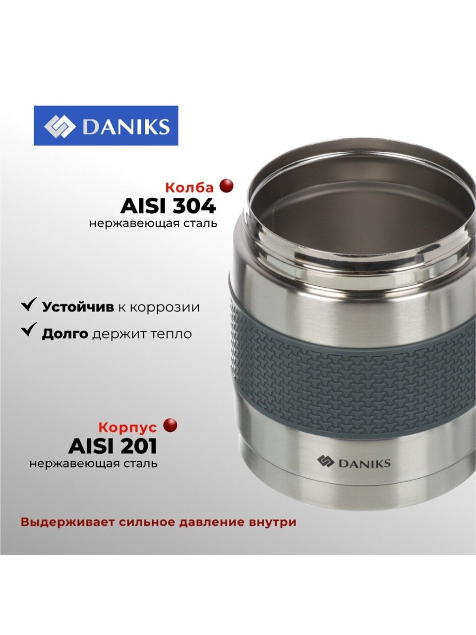 Термос Daniks на 1 литр с широкой горловиной — выбор тех, кто ищет практичный и долговечный контейнер для еды и напитков. Благодаря конструкции из нержавеющей стали он не впитывает запахи, не ржавеет и выдерживает даже экстремальные условия. Удобная навинчивающаяся крышка предотвращает протекание, а ручка облегчает транспортировку.