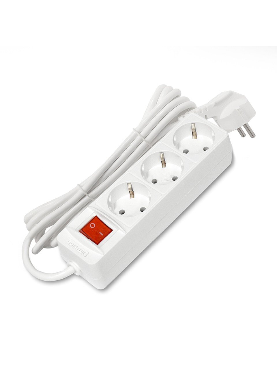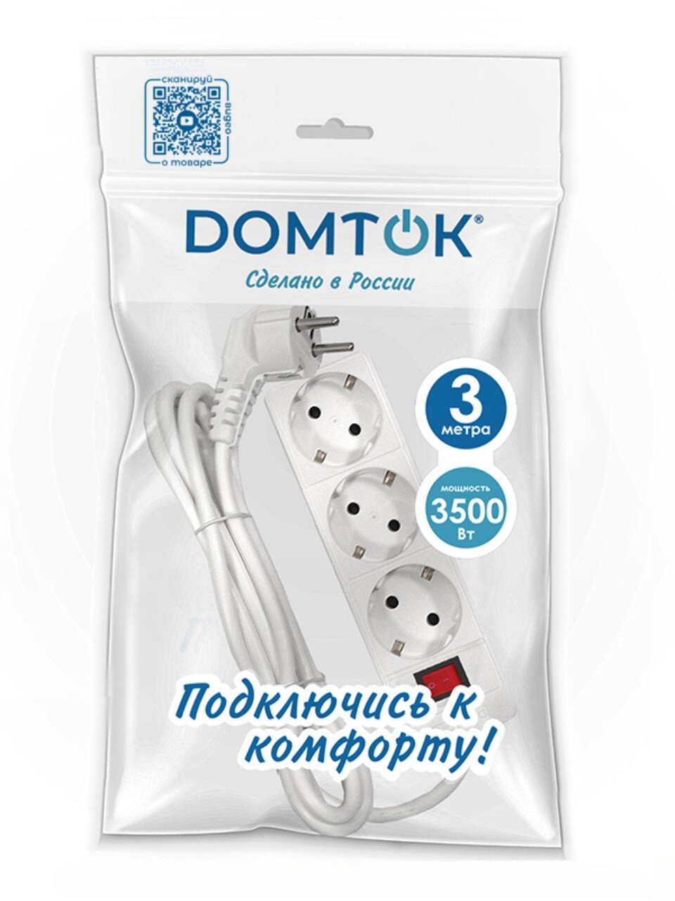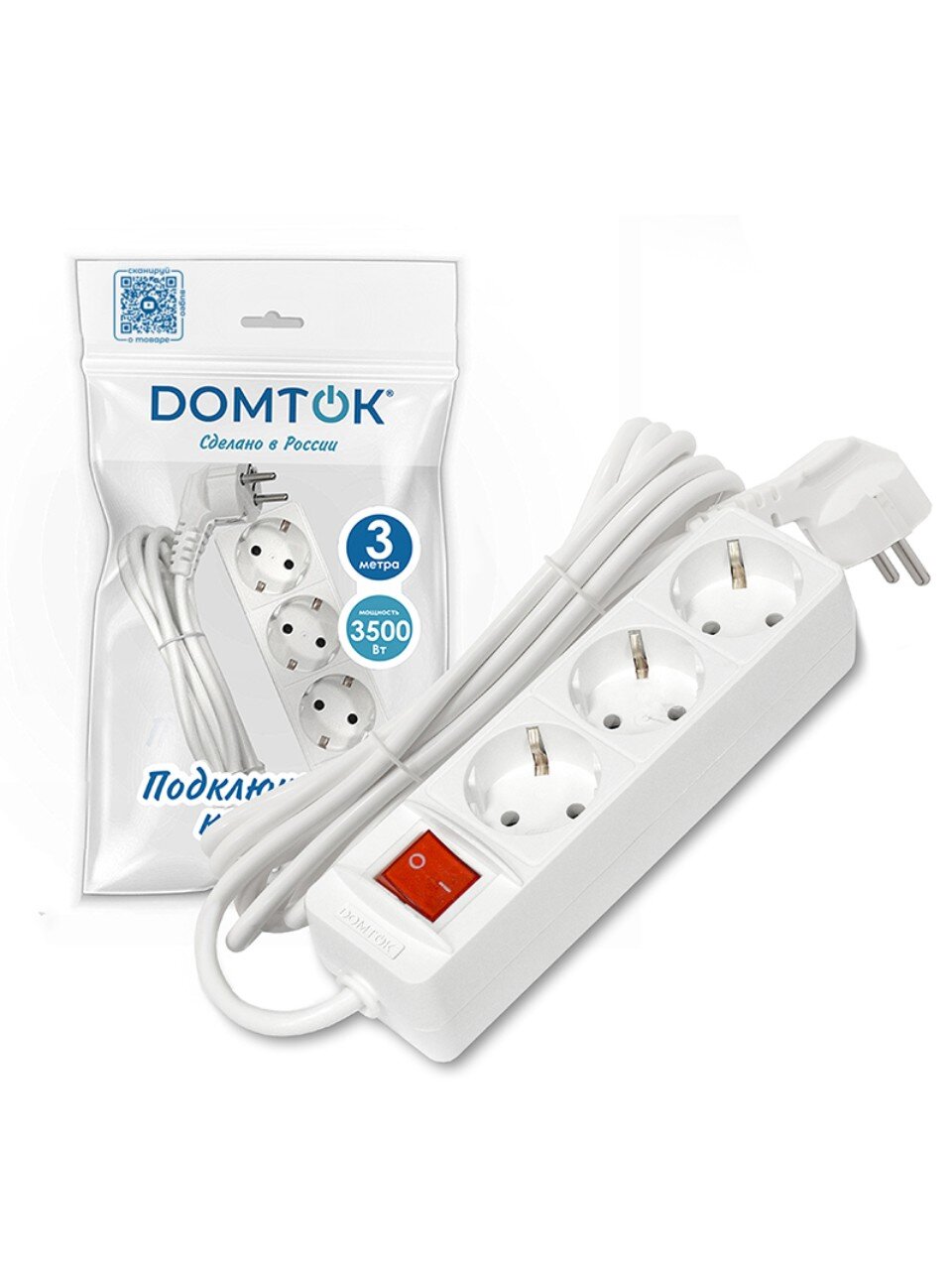Три розетки с заземлением, длина 3 м, провод ПВС 3х1 мм², номинальный ток 16 А, максимальная мощность 3500 Вт, цвет белый, бренд Domtok, артикул 2381.