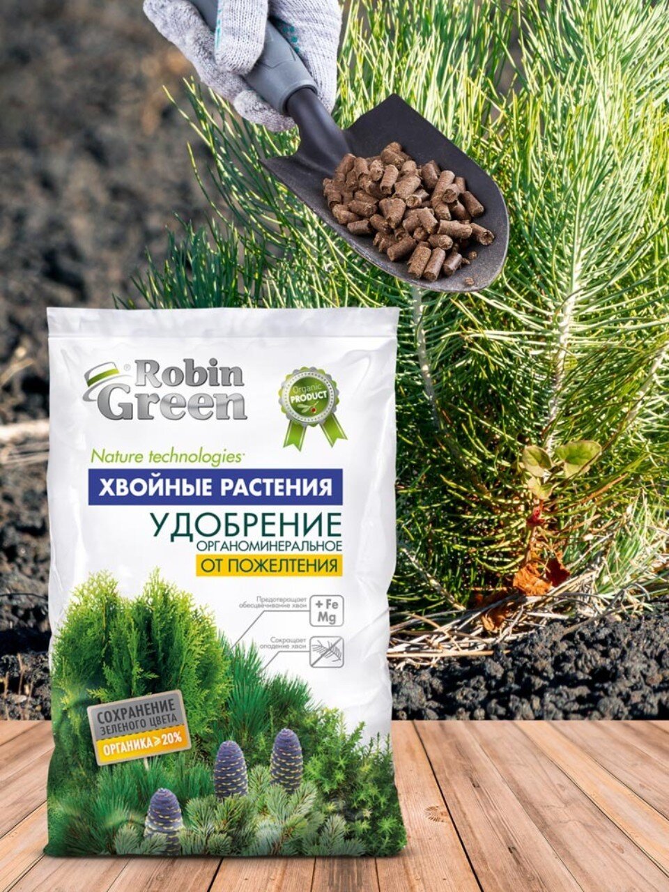 Удобрение Робин Грин органоминеральное 2,5 кг — быстрое решение проблемы пожелтения хвои, эффективная защита и восстановление для хвойных растений на даче и в саду.