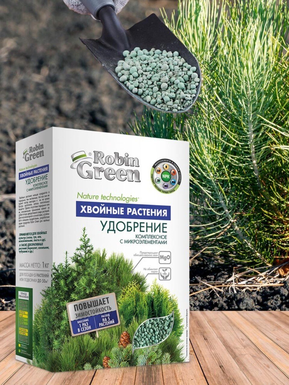 Минеральное удобрение Робин Грин для хвойных с микроэлементами, 1 кг — здоровье и насыщенный цвет ваших елей и туй уже через 2 недели. Экономия времени, защита от пожелтения.