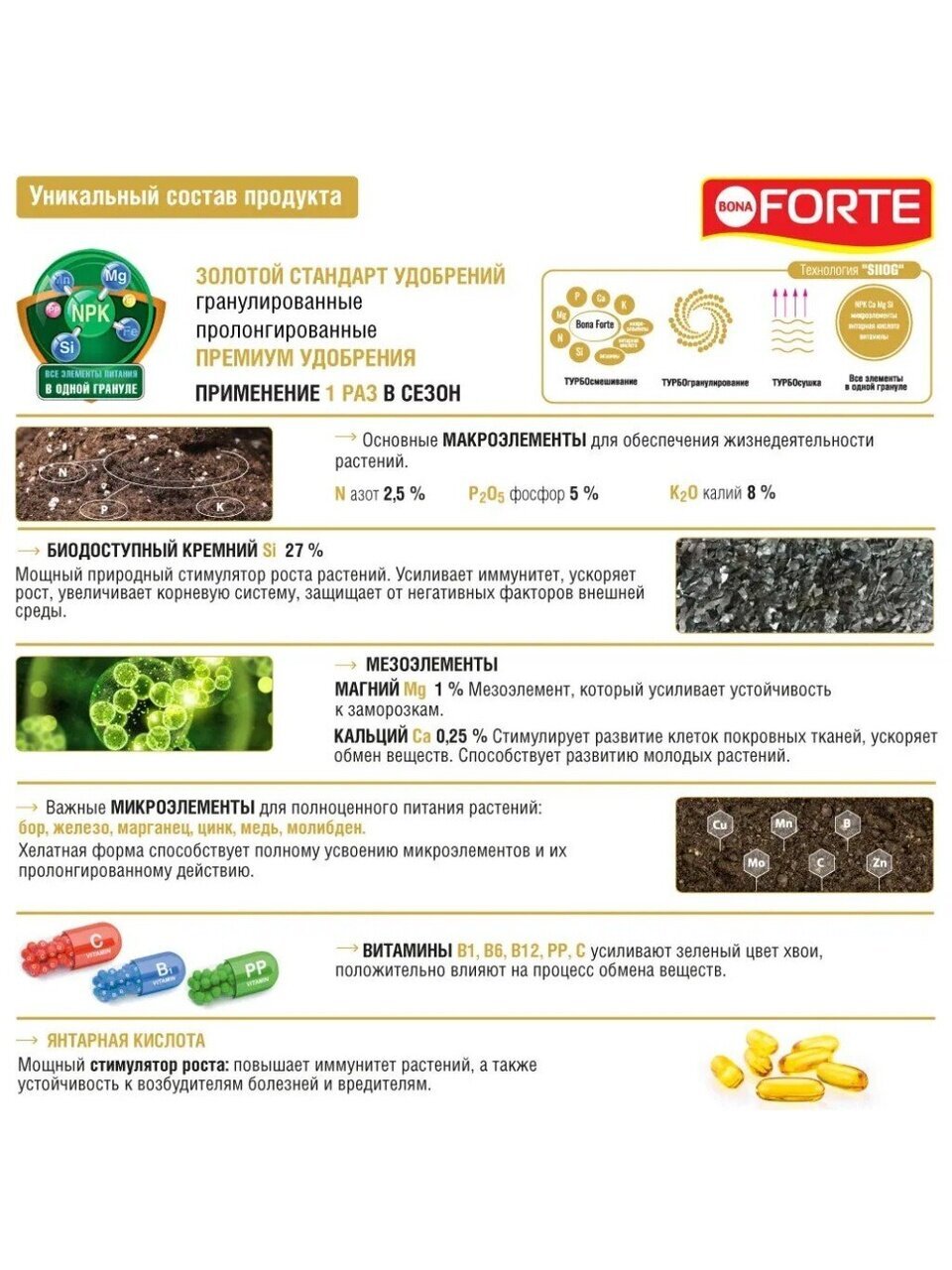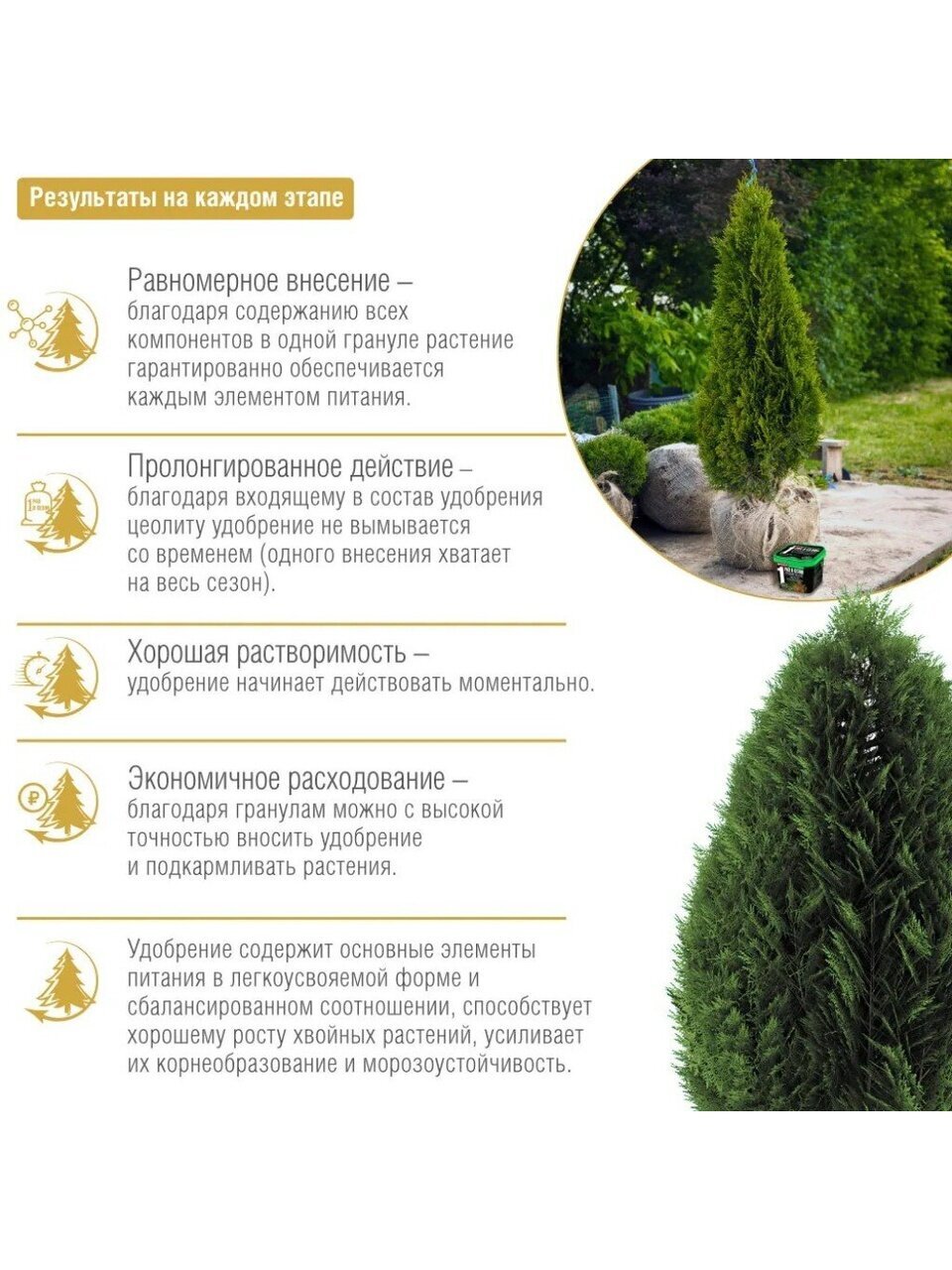 Удобрение содержит основные элементы питания в легкоусвояемой форме и сбалансированном соотношении, способствует хорошему росту хвойных растений, усиливает их корнеобразование и морозоустойчивость.