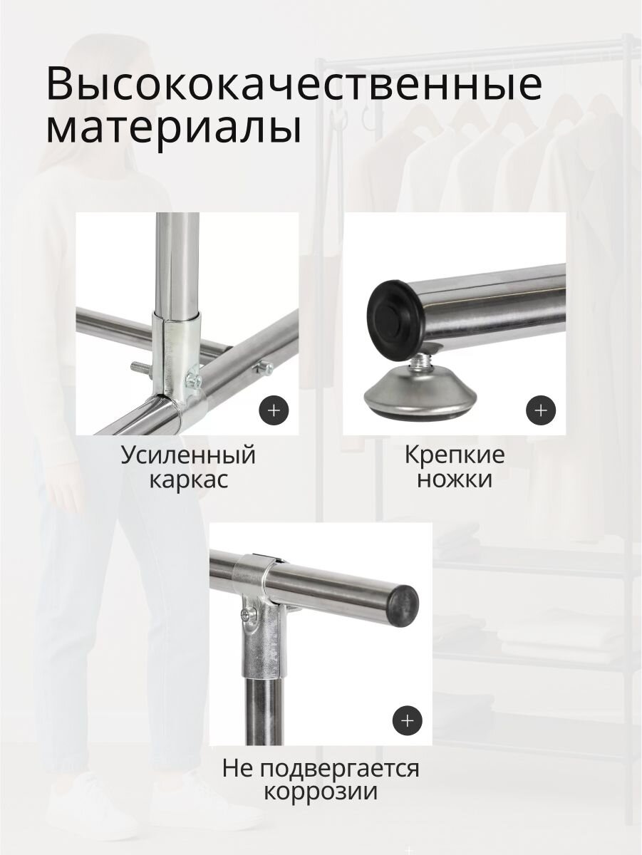 - Усиленная металлическая конструкция — выдерживает вес верхней одежды, костюмов, юбок и брюк.