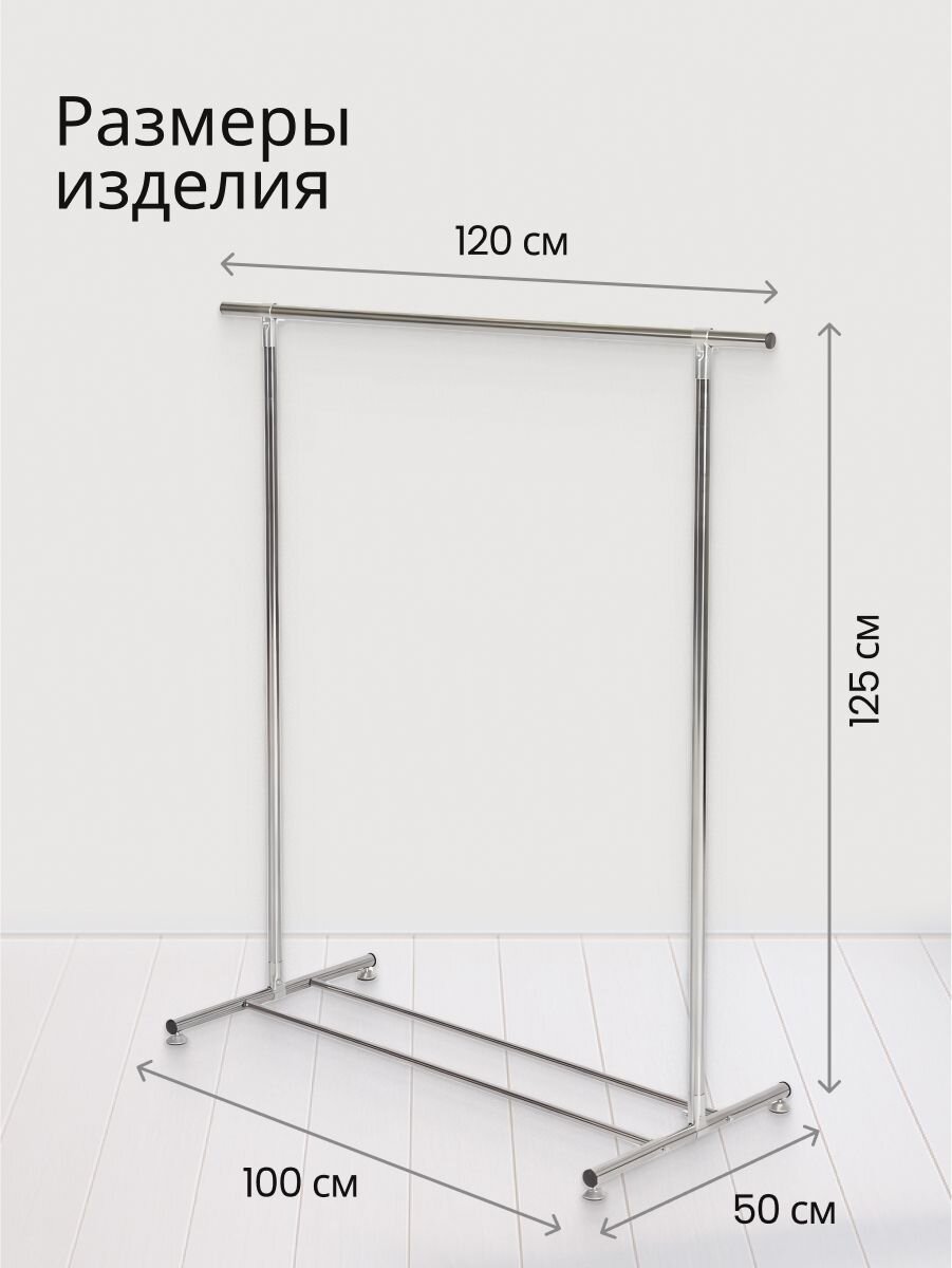 Модель 120х100х50х125 см из металла выдерживает значительный вес, подходит для пальто, курток, пиджаков, брюк и юбок благодаря прочным рейлам и универсальной конструкции.