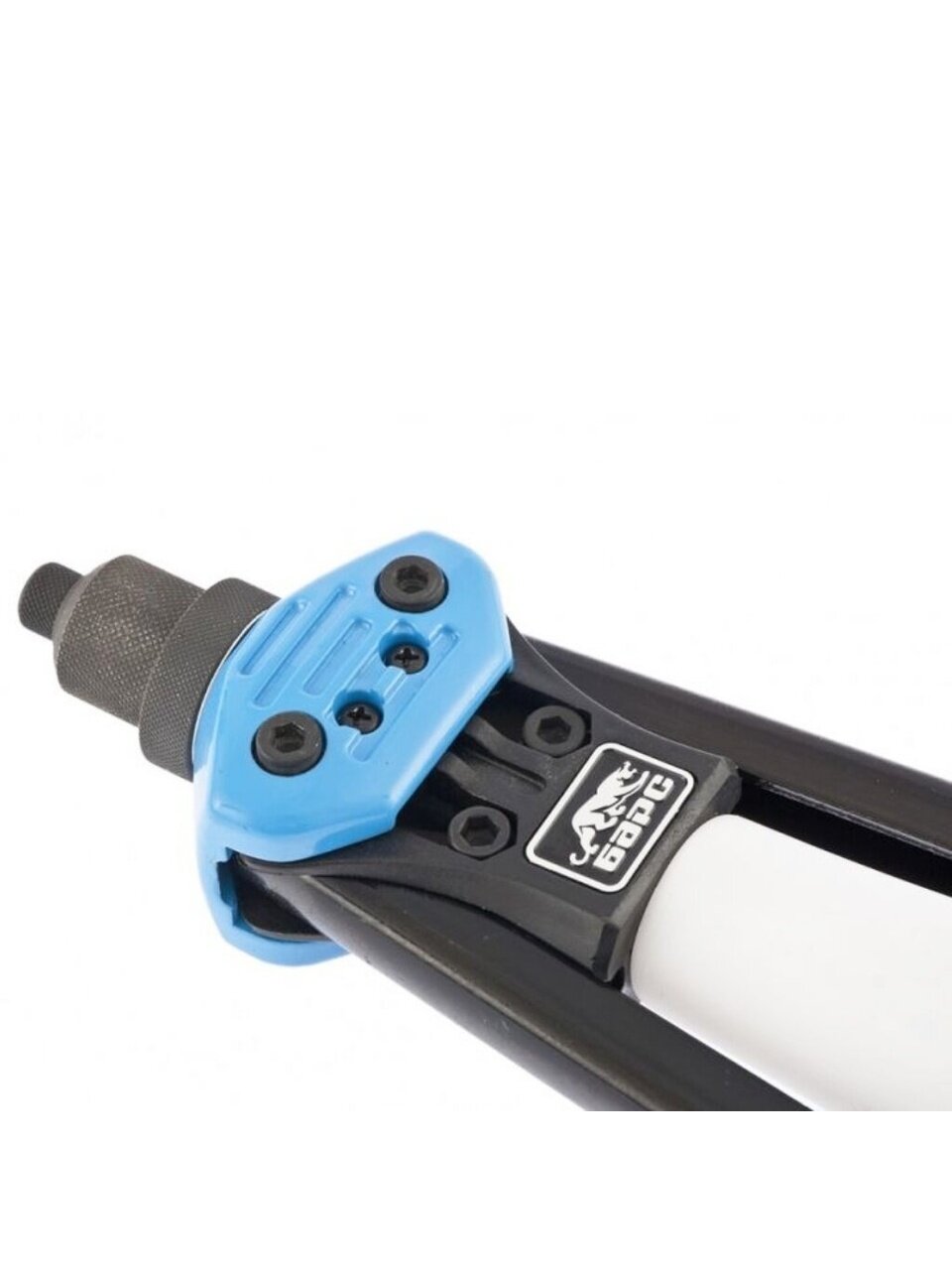 - Инструмент укомплектован насадками для работ с заклепками пяти диаметров 2,4-3,2-4,0-4,8-6,4 мм.
